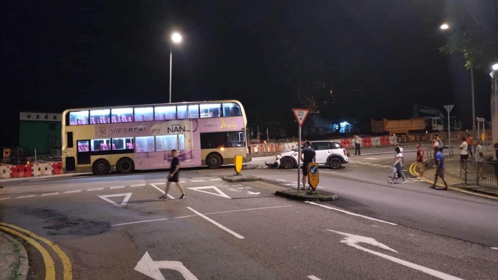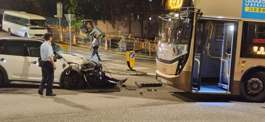 柴灣環翠道昨(8日)晚發生兩車相撞意外,無人受傷。一輛九巴晚上7時許沿環翠道駛至翡翠道對開時,與一輛白色私家車相撞。網上圖片可見,私家車車頭嚴重損毀,零件散落一地,九巴車頭則輕微損毀。