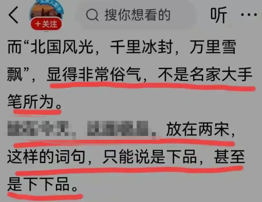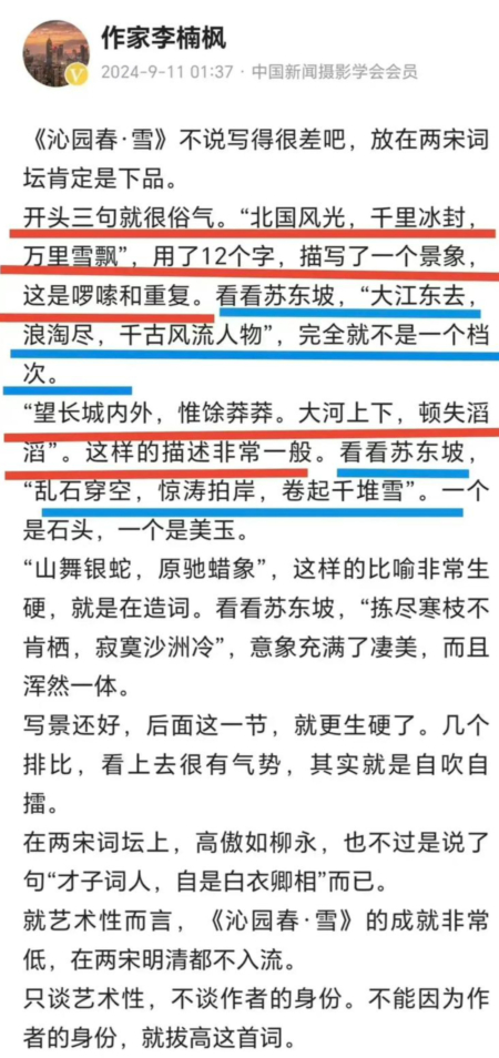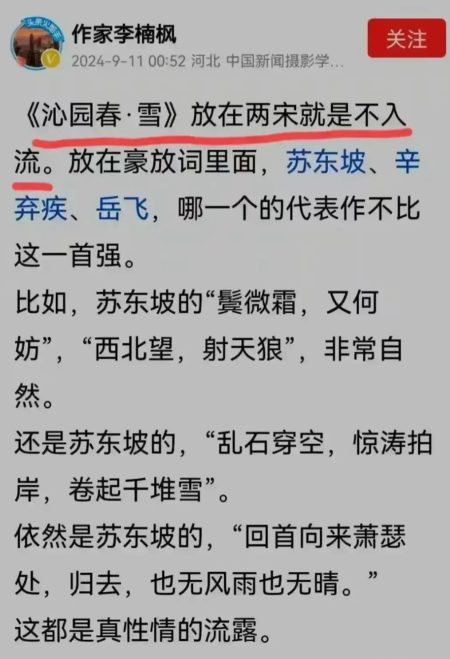 9月11日,「作家李楠楓」在網上發表文章表示,《沁園春‧雪》跟宋朝蘇東坡、辛棄疾等豪放詞比起來,「不說寫得很差吧,放在兩宋詞壇肯定是下品」、甚至「下下品」。