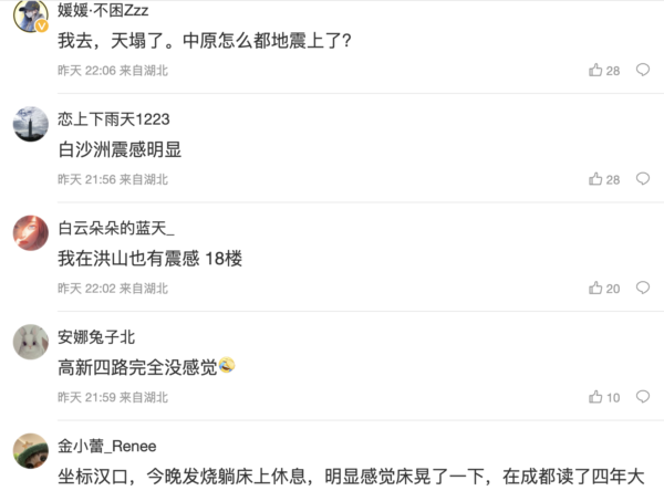 「坐標漢口,今晚發燒躺床上休息,明顯感覺床晃了一下,在成都讀了四年大學的直覺告訴我像地震,過了會兒看新聞就發現果然。」
