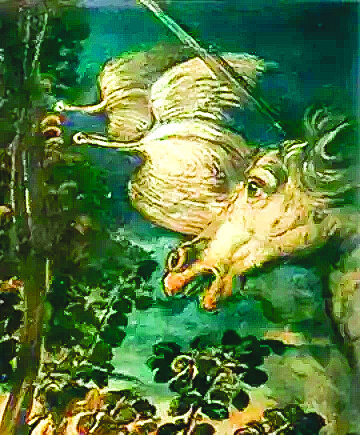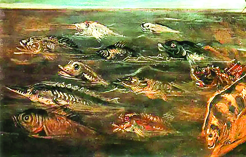 波浪中有各種各樣的海洋動物:鱘魚、鮭魚、還有紅鯔魚(red mullet,一種在地中海發現的緋鯉)。牠們的眼神似乎在說,牠們明白自己要去哪裏:它們在豐富著人的世界。
