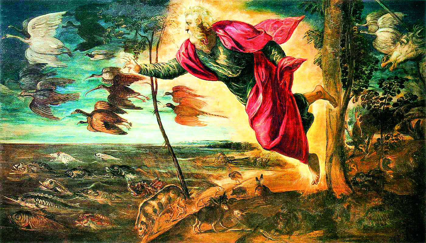 據「創世記的答案」(Answers in Genesis)網站,鳥類學家估計,全世界現存鳥類約10,380種,的確為數眾多。在丁托列托畫作的天空中,有一組剛剛創造出的飛鳥:天鵝、鴨子,可能還有長嘴鵜鶘。牠們才一成形就展翅飛翔。神動一念,就迅速完成一切。