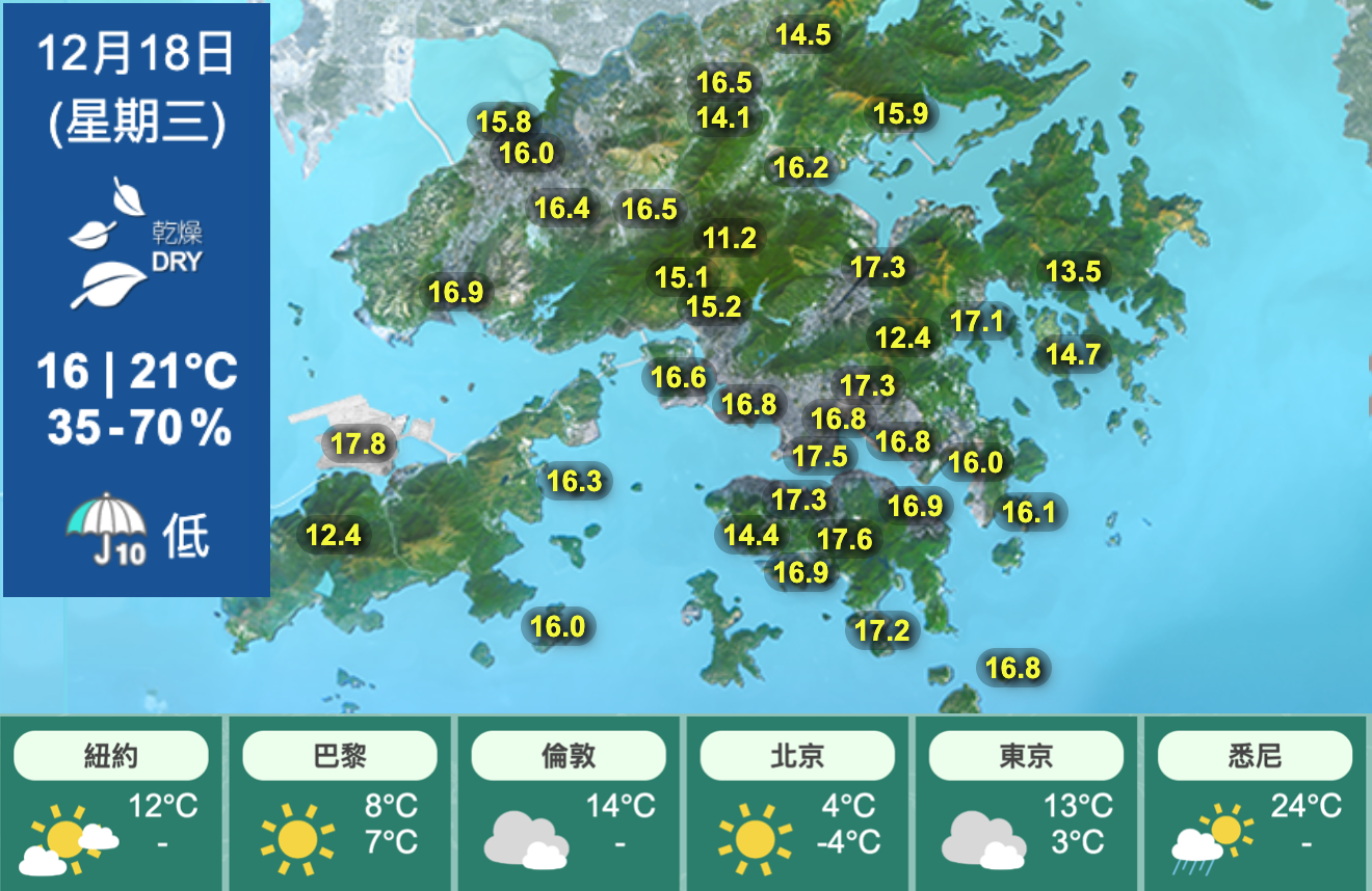 展望本周餘下時間至聖誕節早晚持續清涼,日間大致天晴及非常乾燥。本星期五市區最低氣溫在13度左右,新界再低幾度。