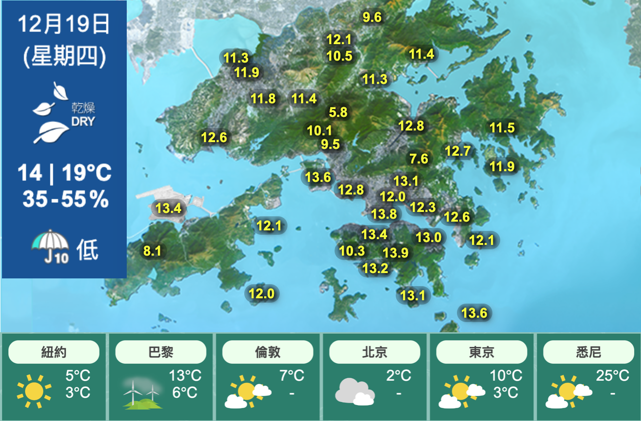 天文台表示,受東北季候風影響,天氣晴朗及非常乾燥。此外,位於菲律賓南部附近的低壓區正為該區帶來不穩定天氣。預測本港今日天晴及非常乾燥,最高氣溫約19度。吹和緩北至東北風。紅色火災危險警告繼續生效。展望明早市區最低氣溫下降至13度左右,新界再低幾度及普遍寒冷。周末期間早上相當清涼,日間非常乾燥。下周初至聖誕節早晚仍然清涼,日間部份時間有陽光。