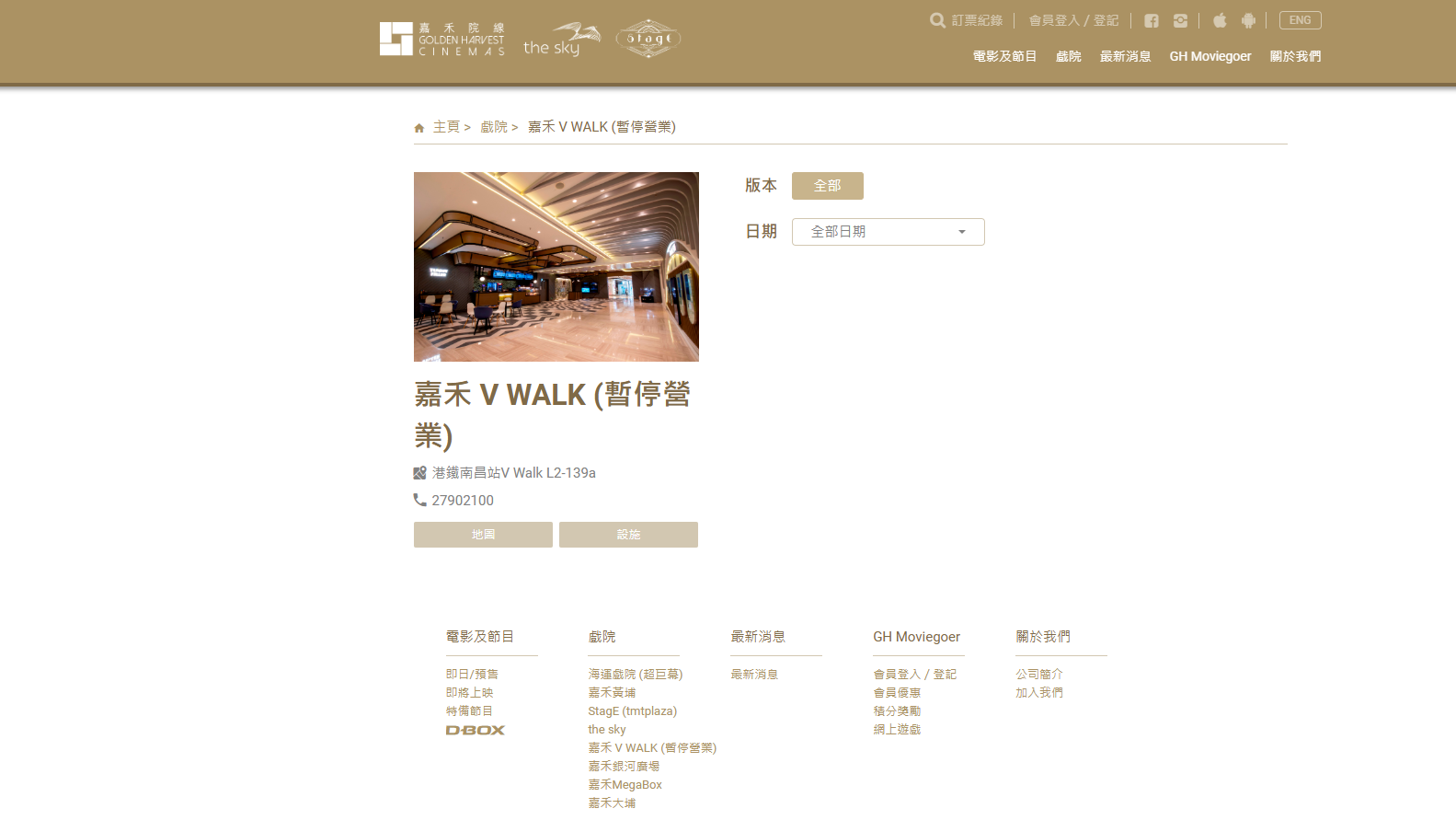 2019年7月開業、位於西九龍南昌的嘉禾V Walk近日被發現其網站及手機程式未再發售今日(27日)及之後的戲票,橙天嘉禾院線官方網頁亦宣布嘉禾V Walk暫停營業。
