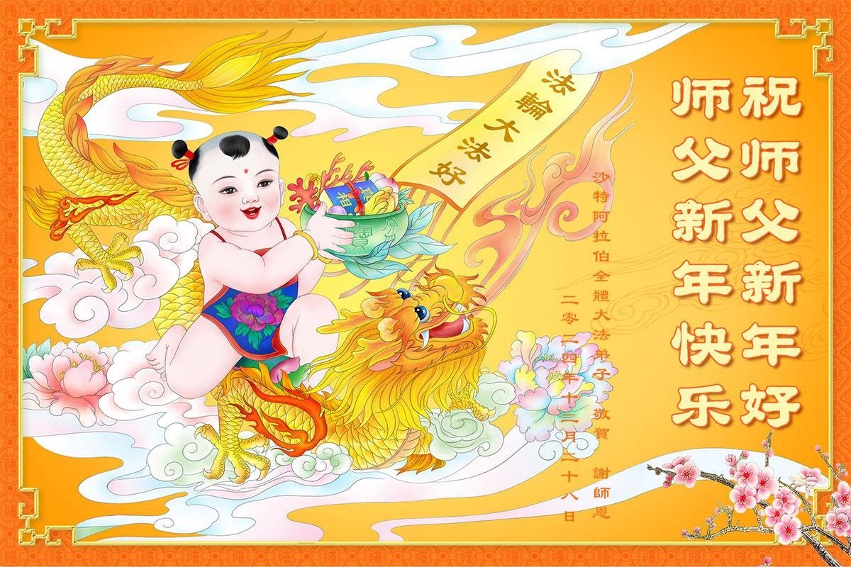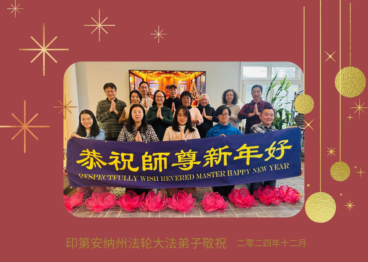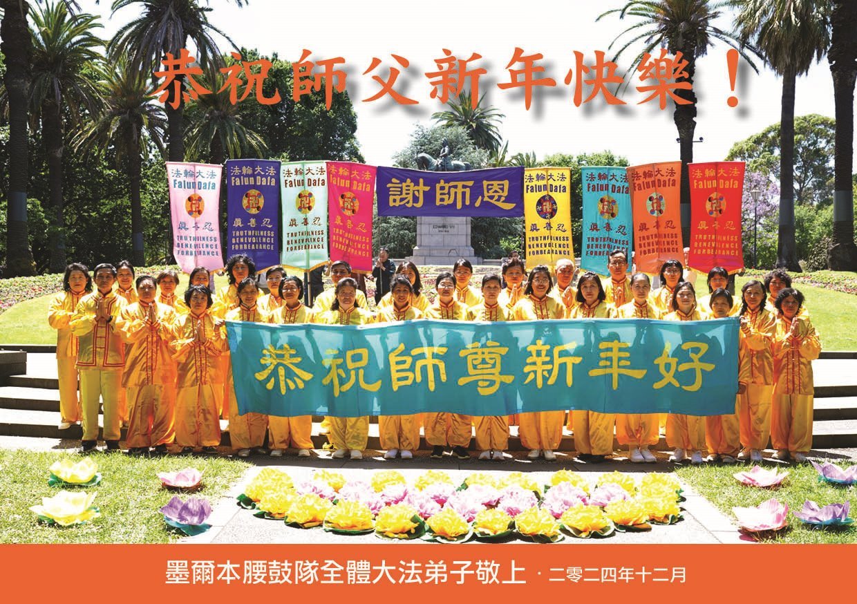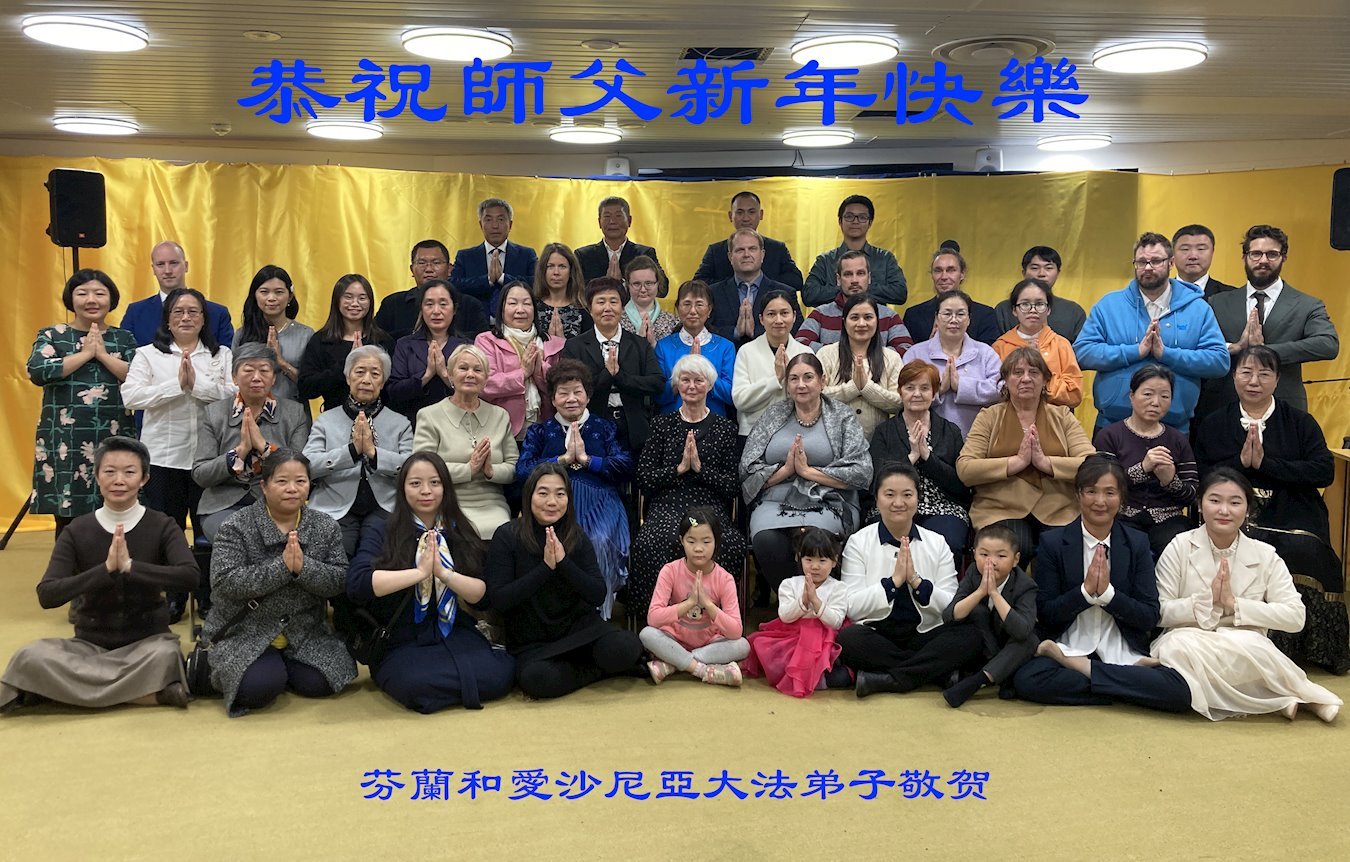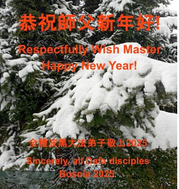 法輪功學員寫道:「恭祝師父新年好!我們對慈悲的師父感恩之心無以言表。新的一年,我們將努力做好三件事。我們會努力沿著師父安排的道路一起走下去。法輪大法好!真善忍好!謝謝師父!」(譯文)