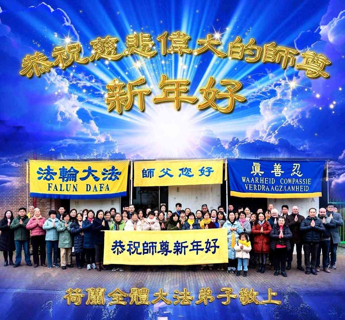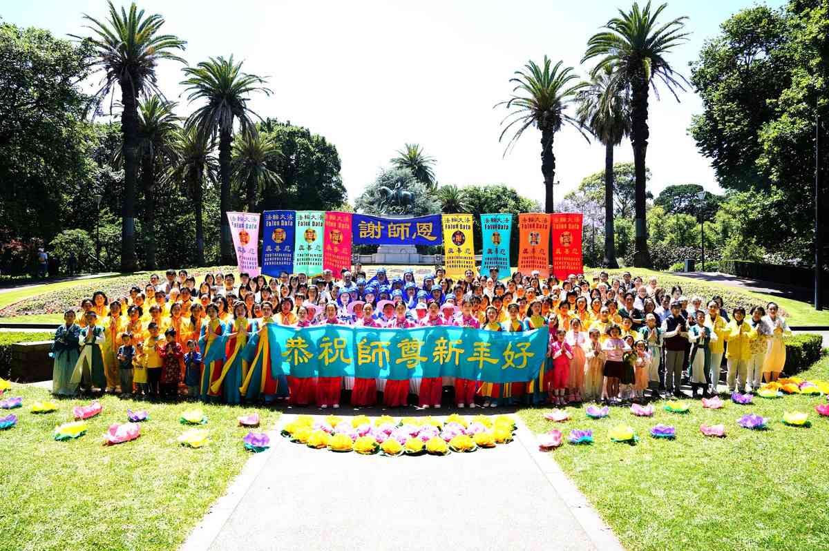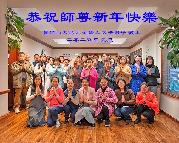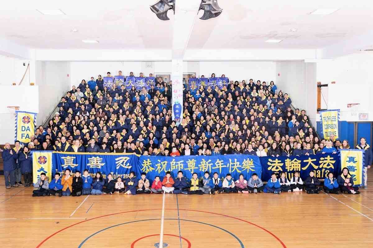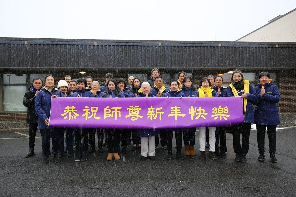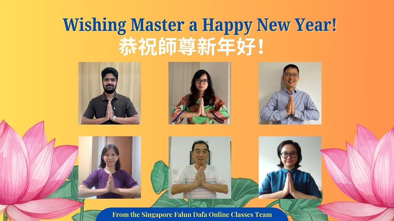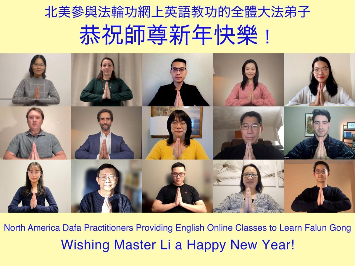 他們不分種族、地域、年齡、性別,不分修煉時日長短,穿著整齊的服裝,雙手合十,齊聲恭祝:「師尊新年快樂!法輪大法好!真善忍好!」