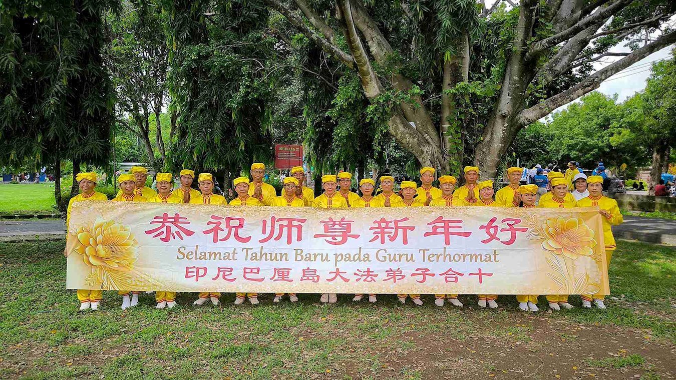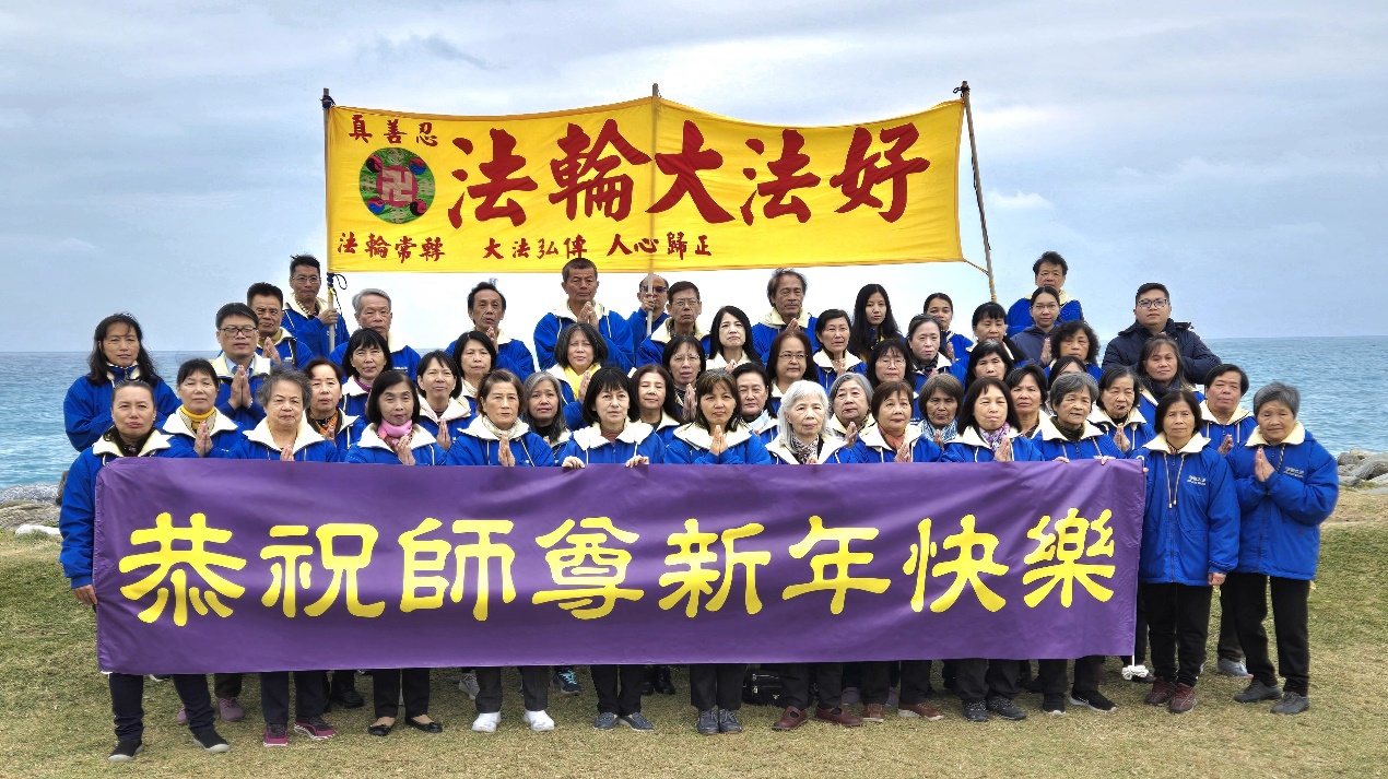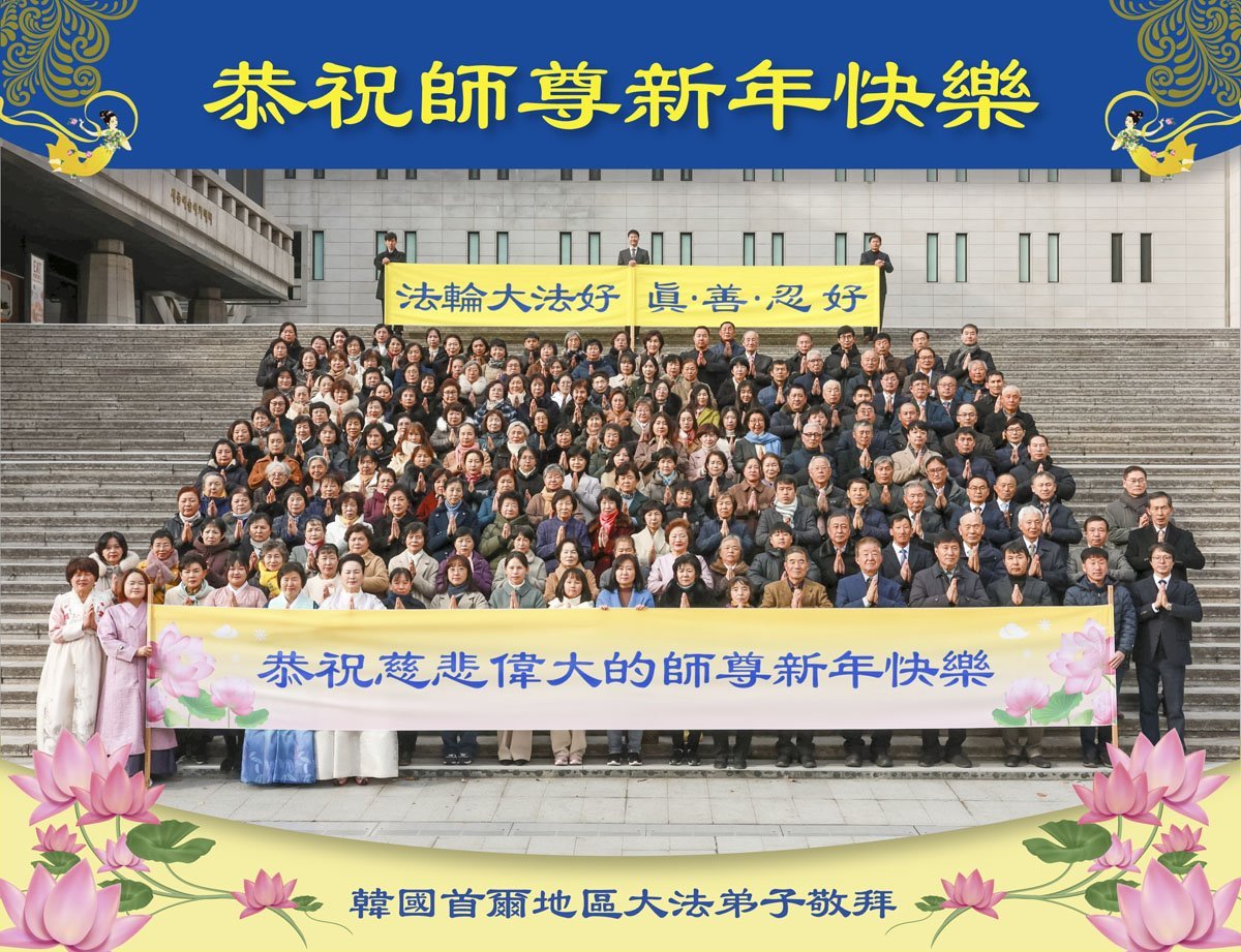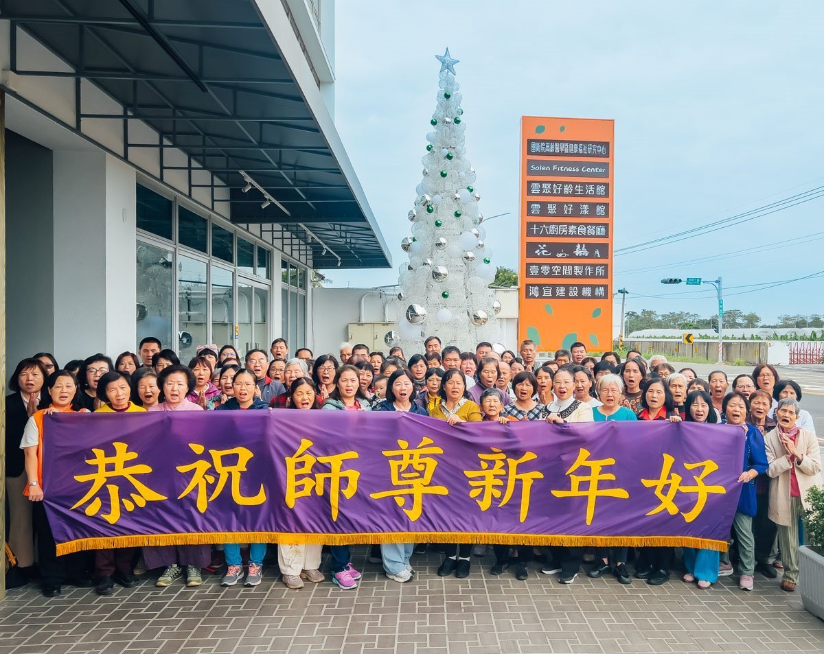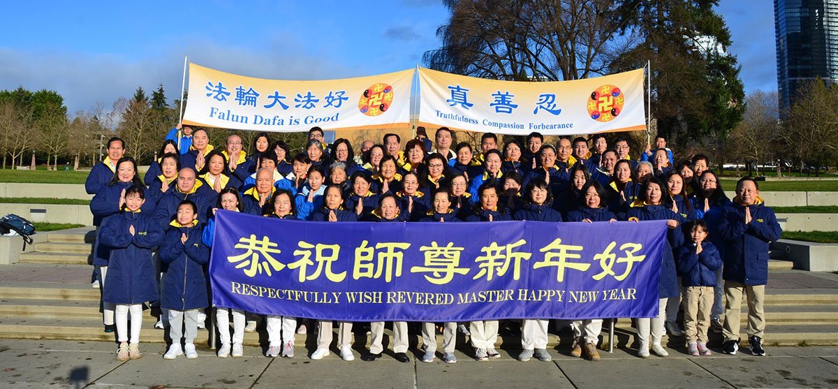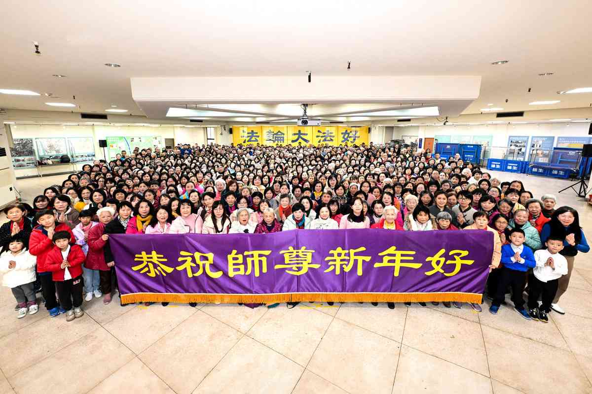 他們不分種族、地域、年齡、性別,不分修煉時日長短,穿著整齊的服裝,雙手合十,齊聲恭祝:「師尊新年快樂!法輪大法好!真善忍好!」