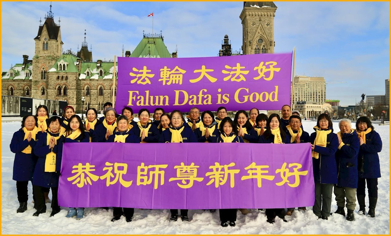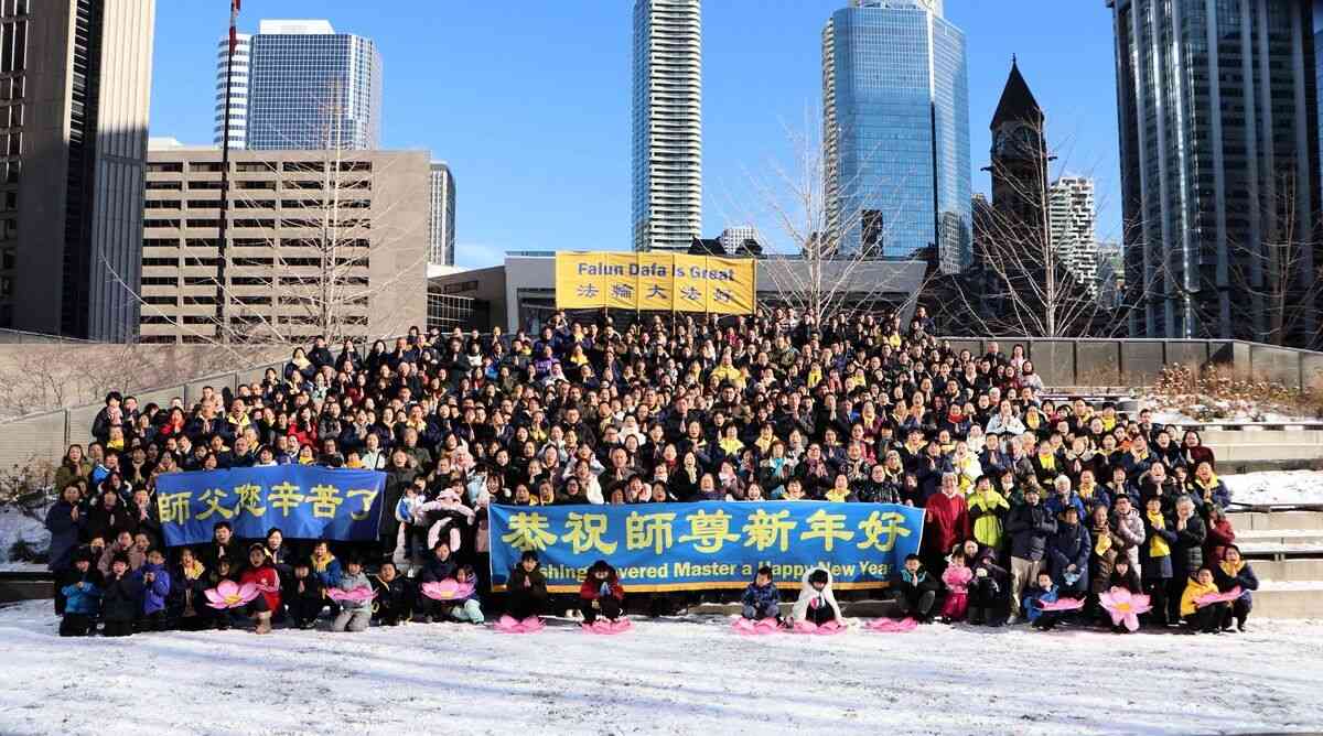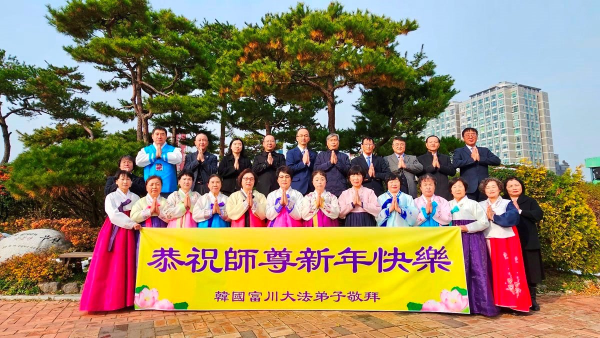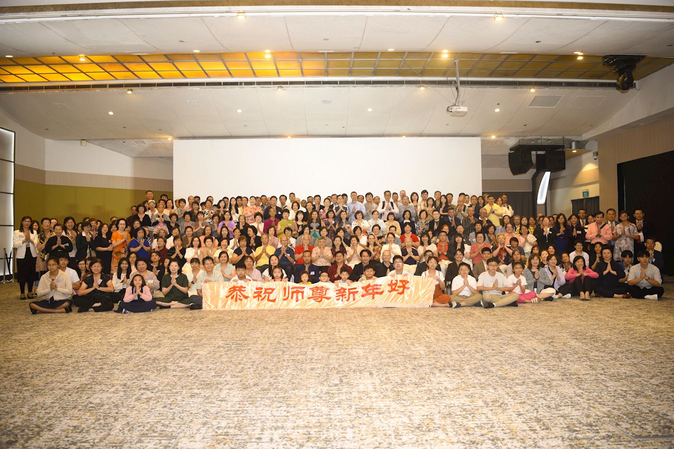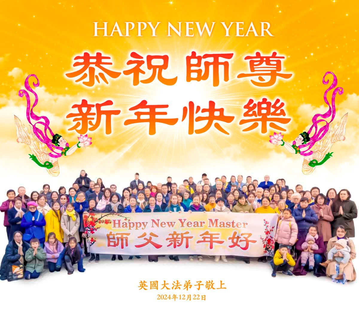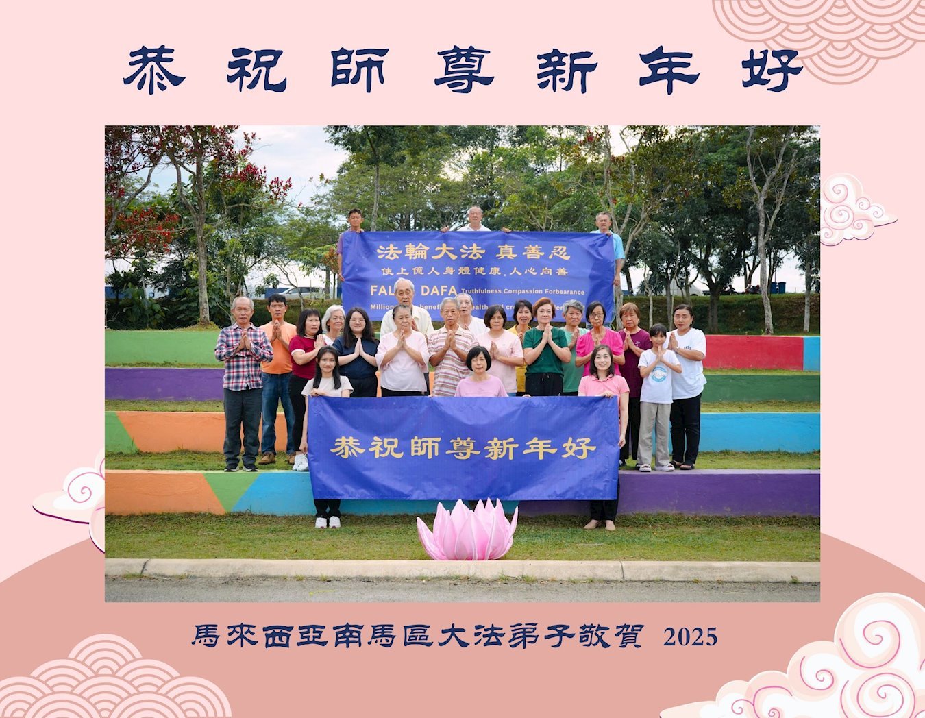 他們不分種族、地域、年齡、性別,不分修煉時日長短,穿著整齊的服裝,雙手合十,齊聲恭祝:「師尊新年快樂!法輪大法好!真善忍好!」