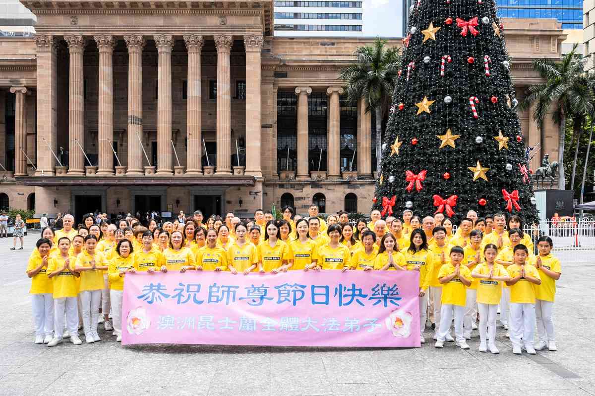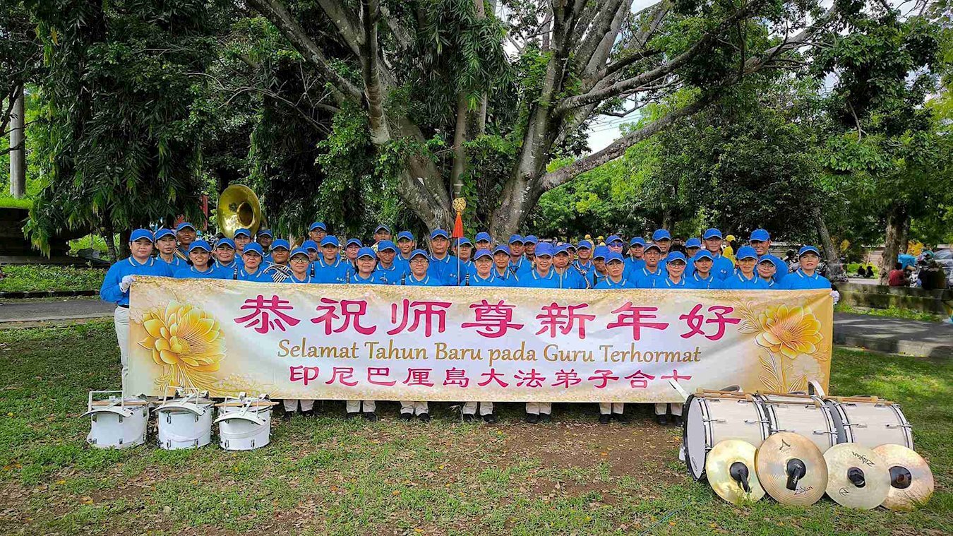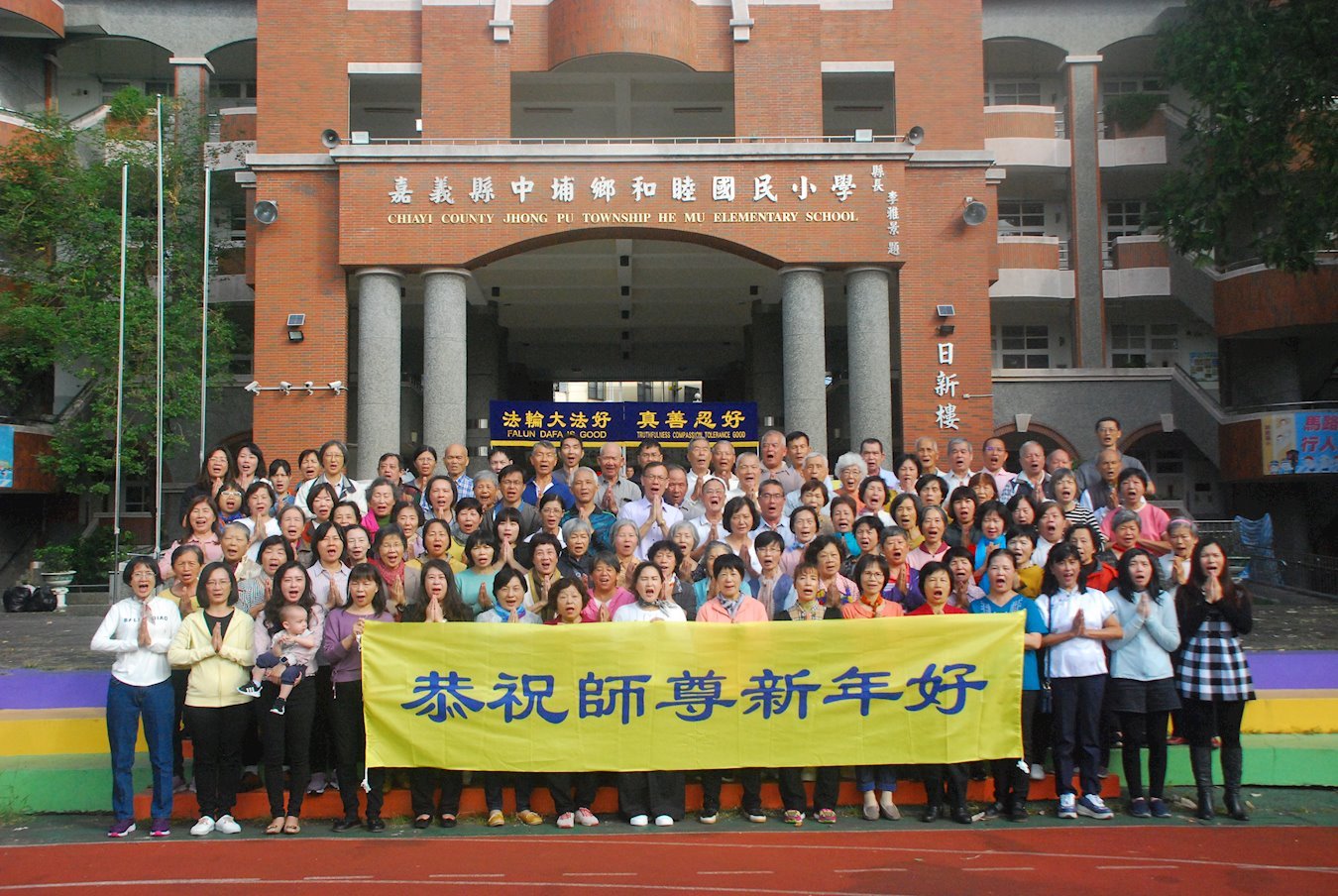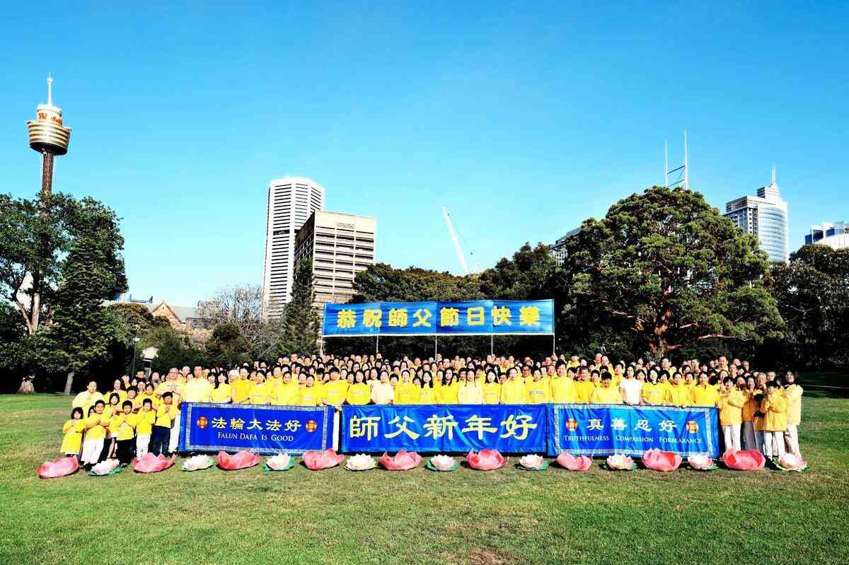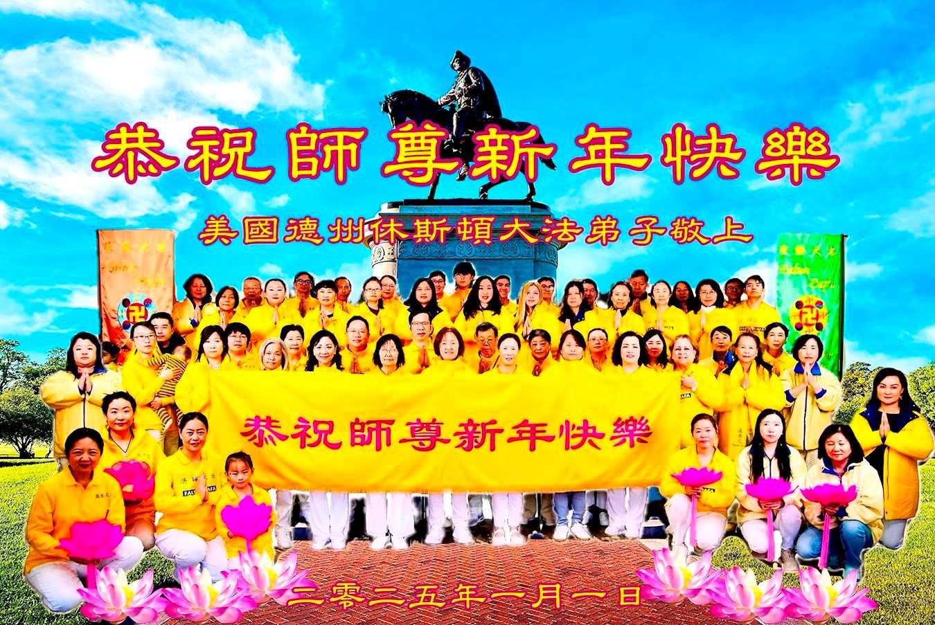 他們不分種族、地域、年齡、性別,不分修煉時日長短,穿著整齊的服裝,雙手合十,齊聲恭祝:「師尊新年快樂!法輪大法好!真善忍好!」