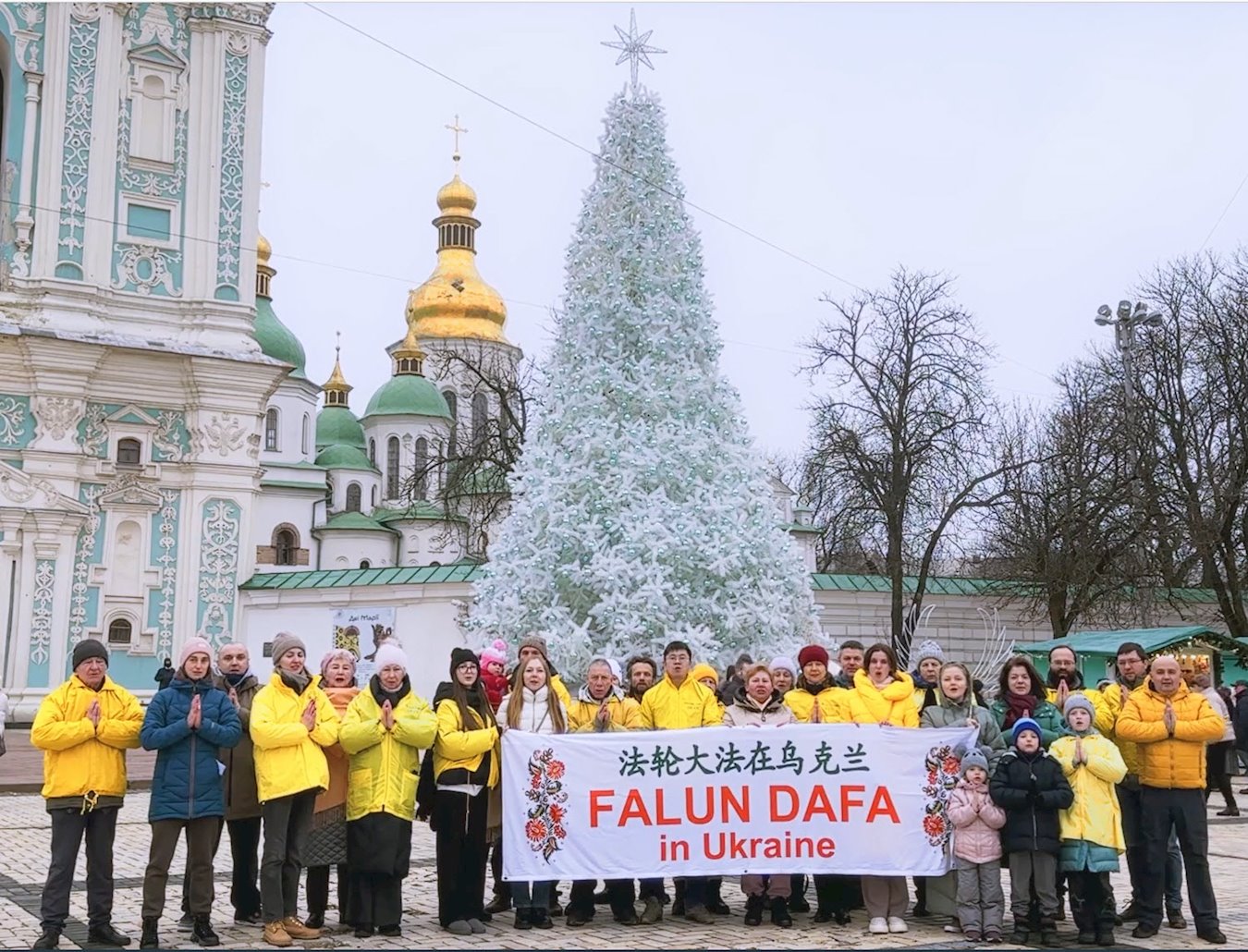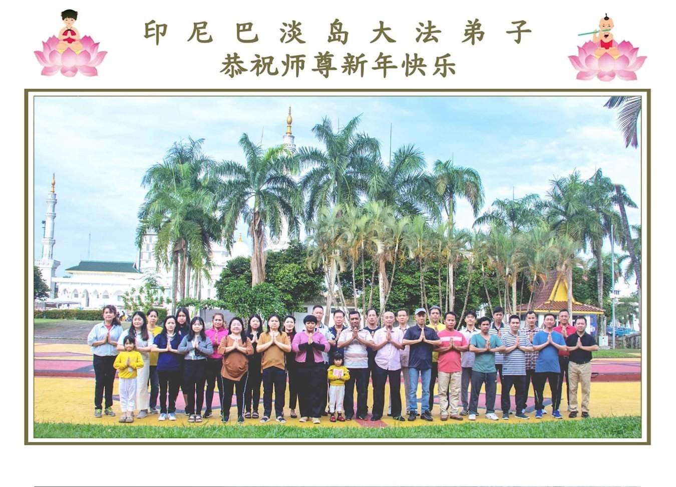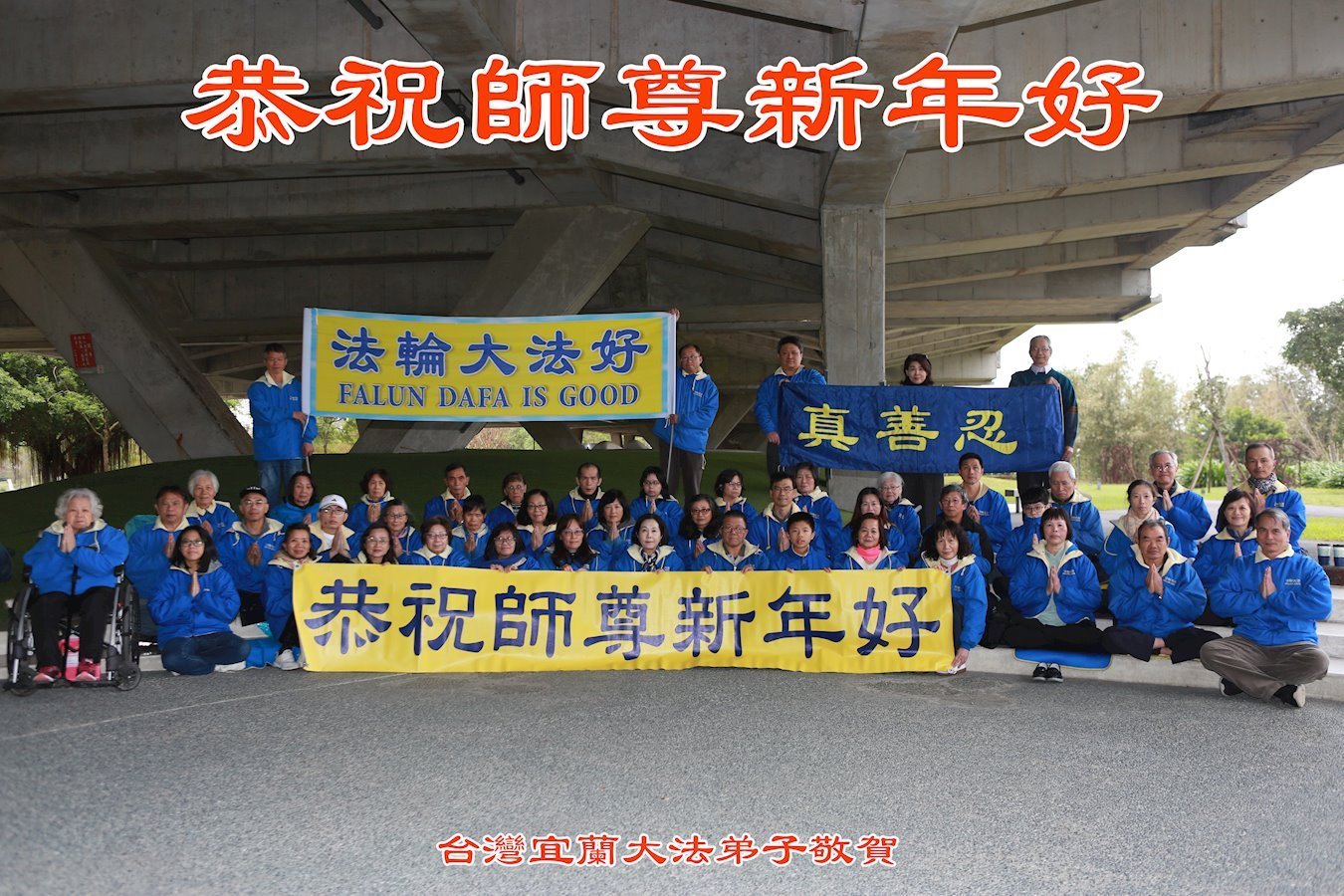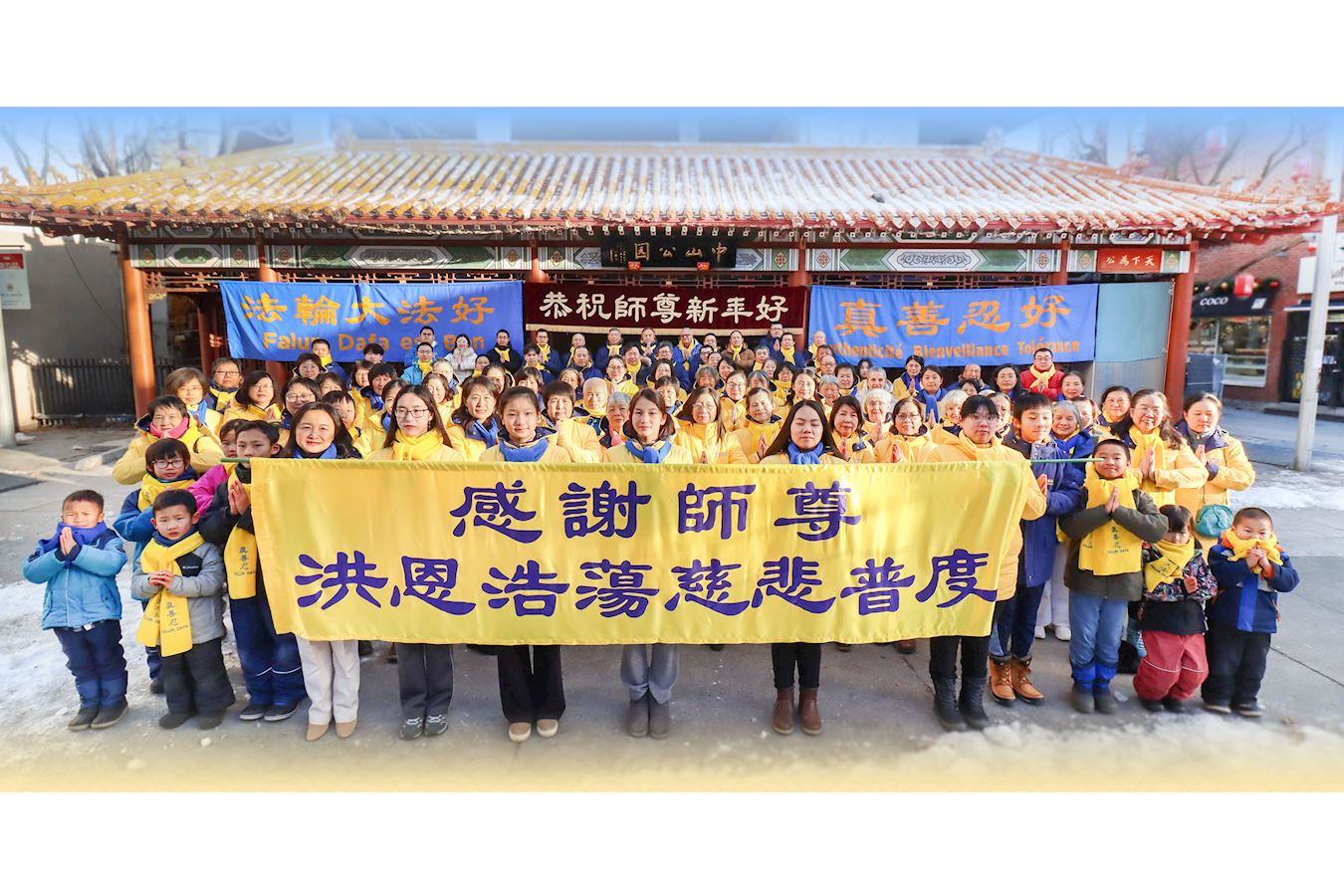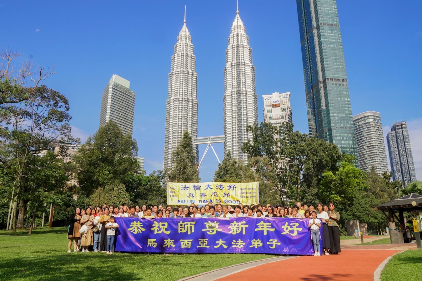 他們不分種族、地域、年齡、性別,不分修煉時日長短,穿著整齊的服裝,雙手合十,齊聲恭祝:「師尊新年快樂!法輪大法好!真善忍好!」