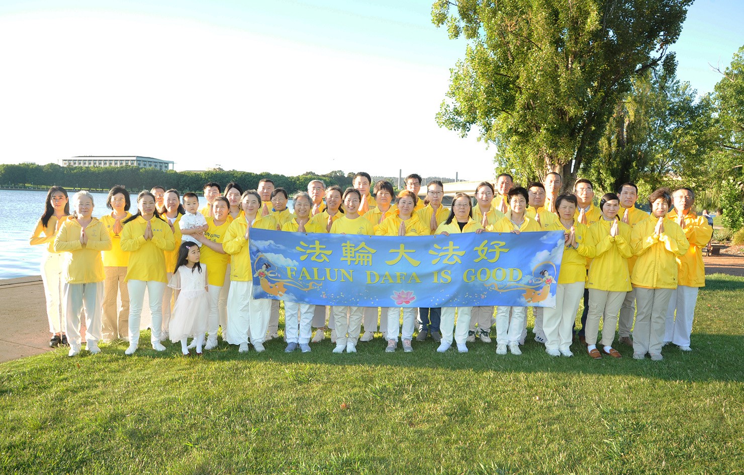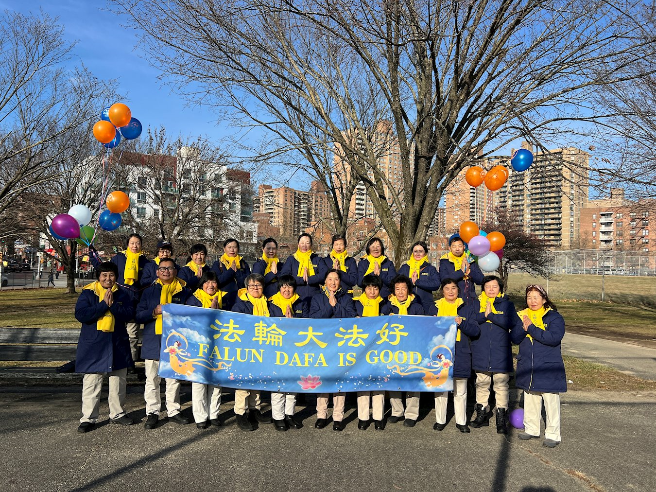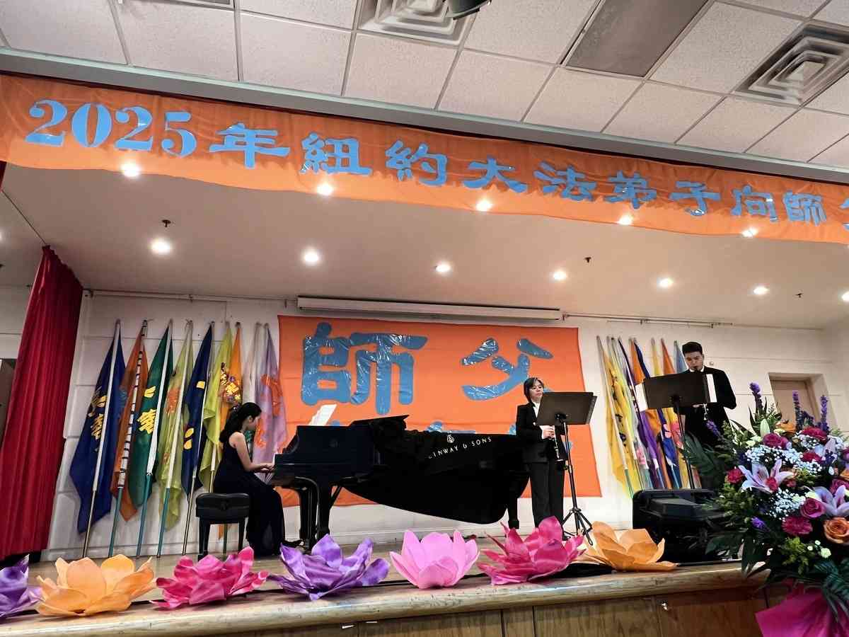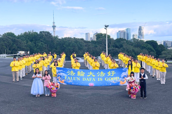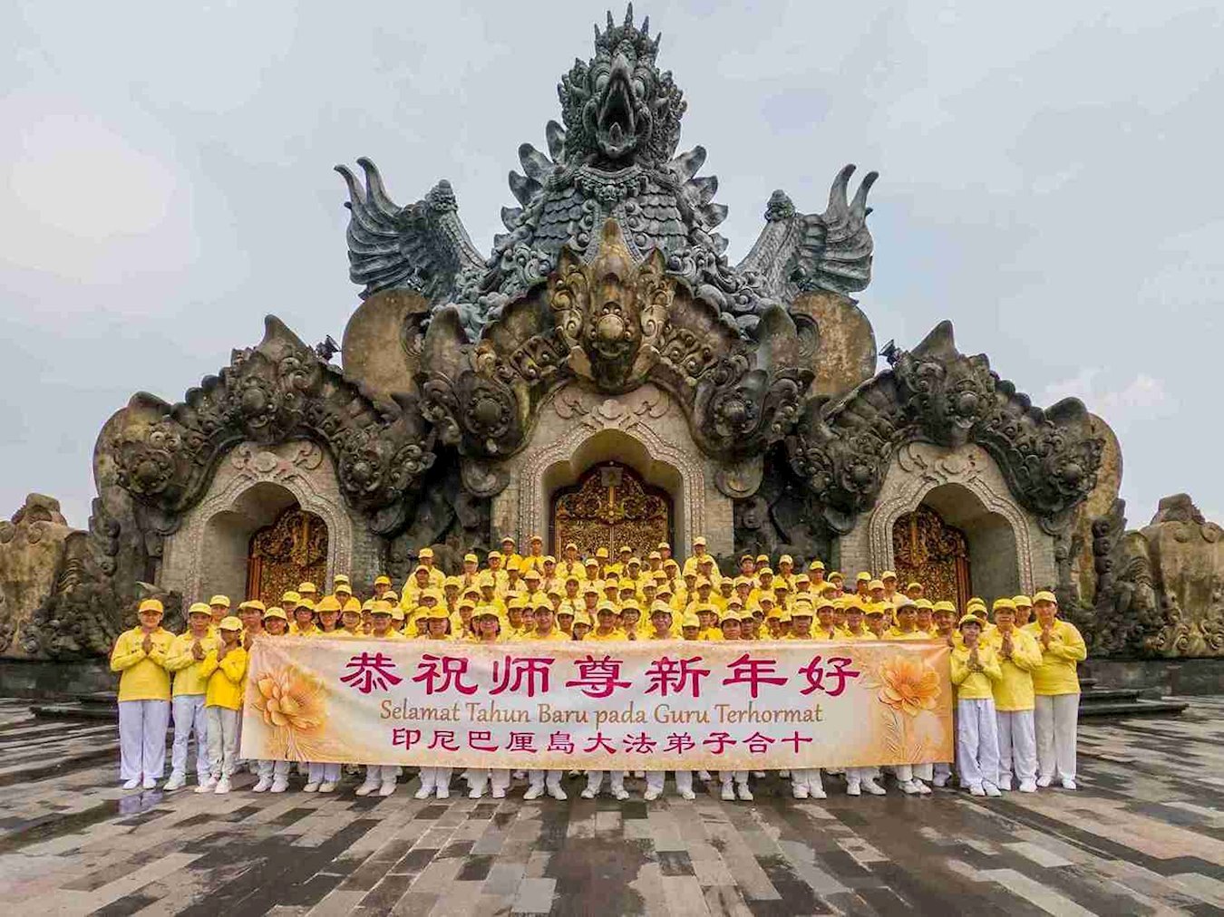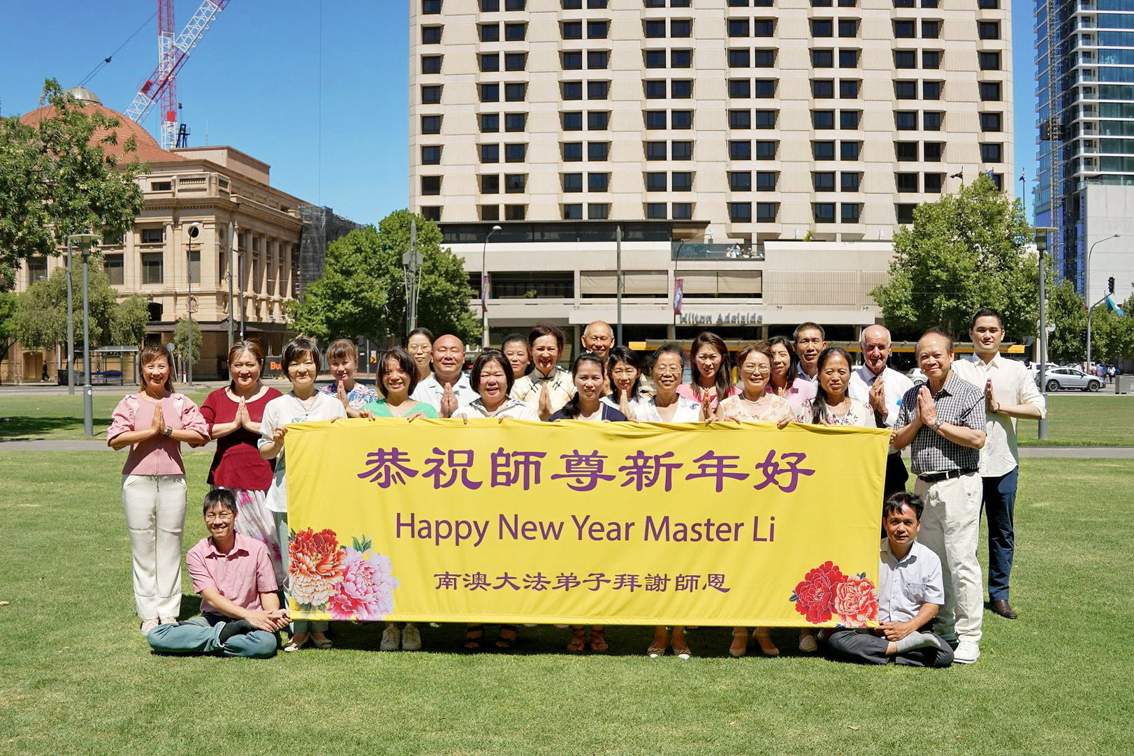 他們不分種族、地域、年齡、性別,不分修煉時日長短,穿著整齊的服裝,雙手合十,齊聲恭祝:「師尊新年快樂!法輪大法好!真善忍好!」