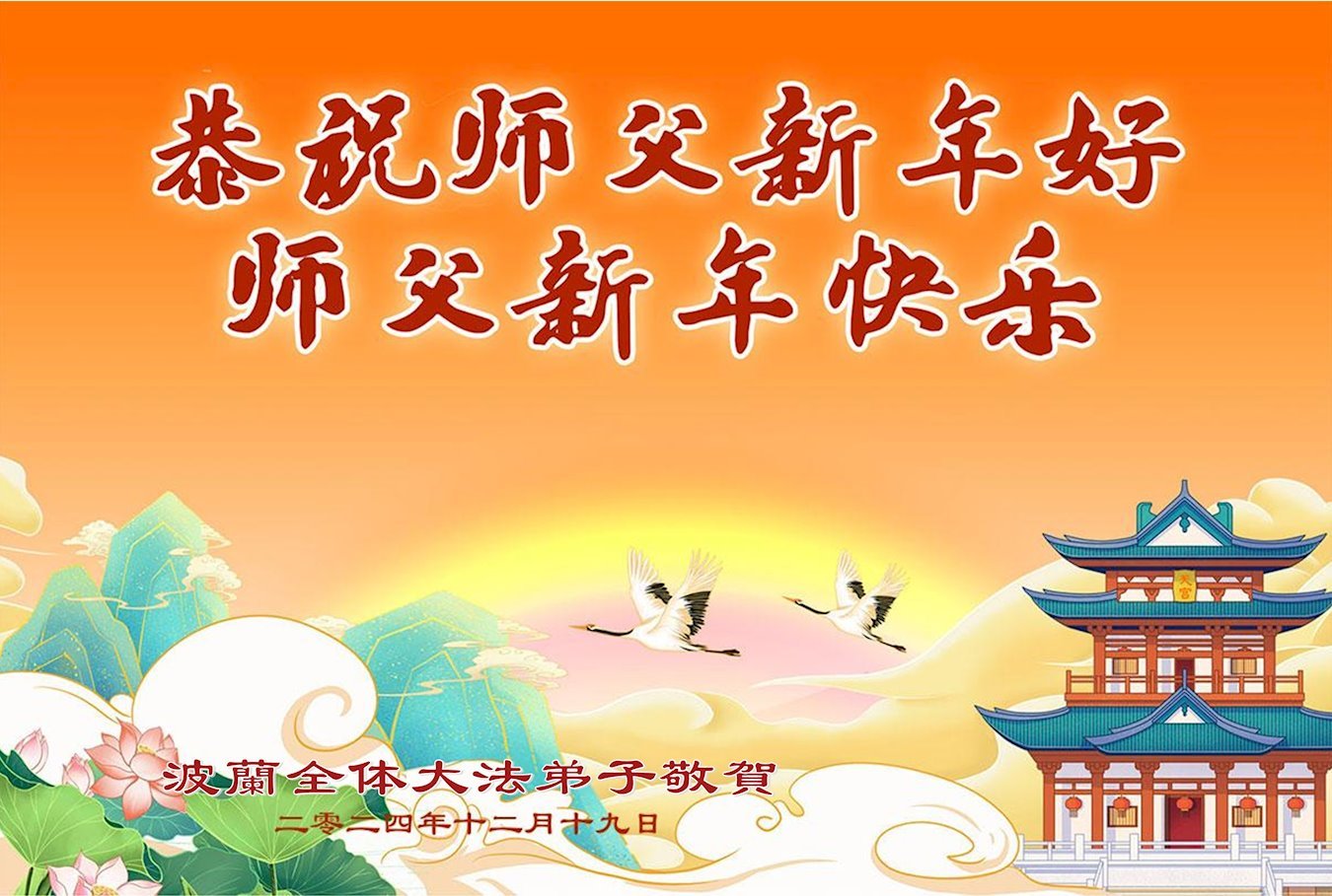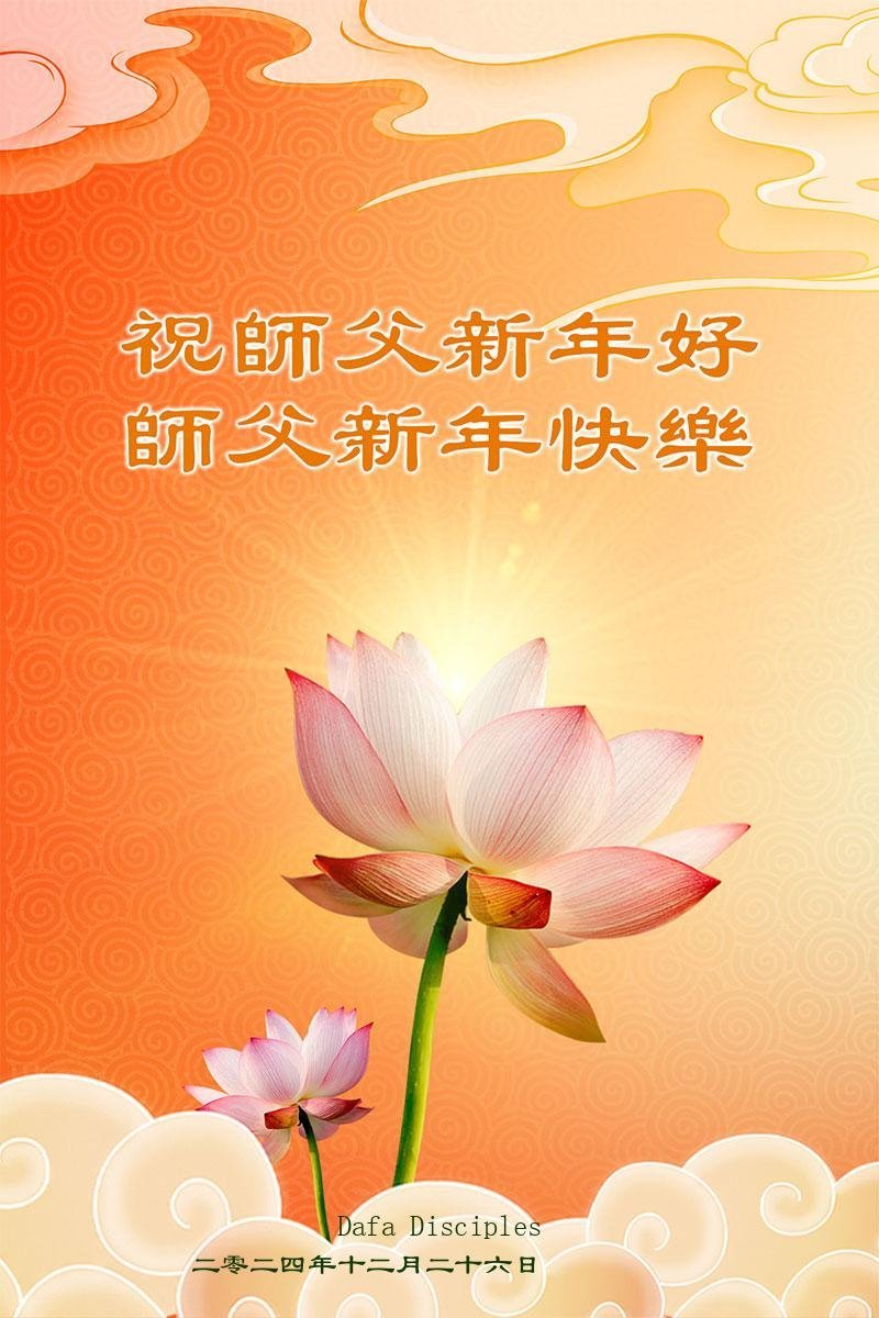 法輪功學員寫道:「感恩師尊慈悲救度!弟子們要謹記師尊的教誨,做好三件事,將大法的美好傳給眾生。精進實修,願師尊少些操勞,多一些欣慰是弟子們新年的心願。」
