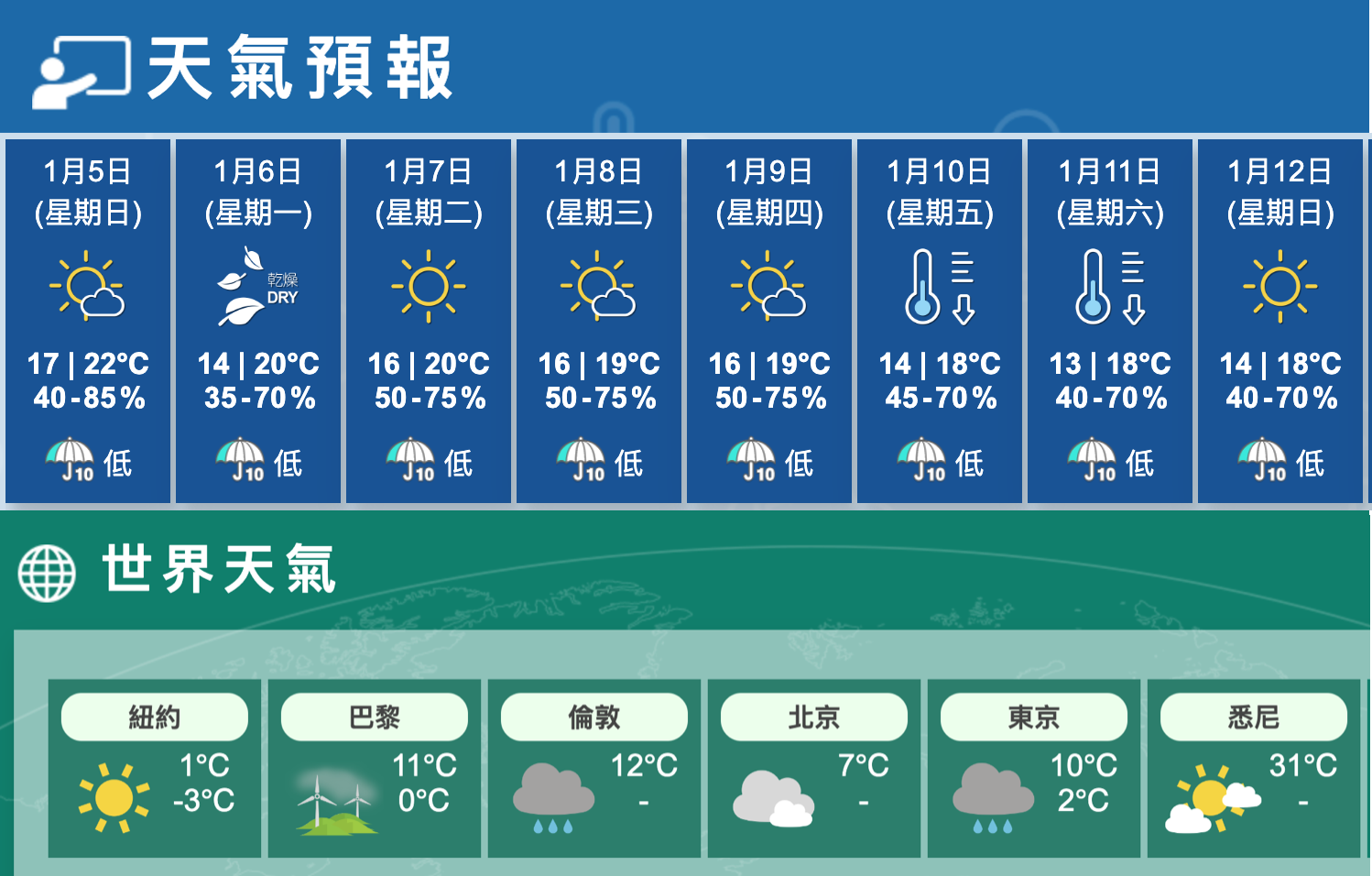 天文台表示,乾燥的東北季候風正帶來普遍晴朗的天氣。預測今日(5日)大致天晴及乾燥。吹和緩北至東北風。紅色火災危險警告繼續生效。
