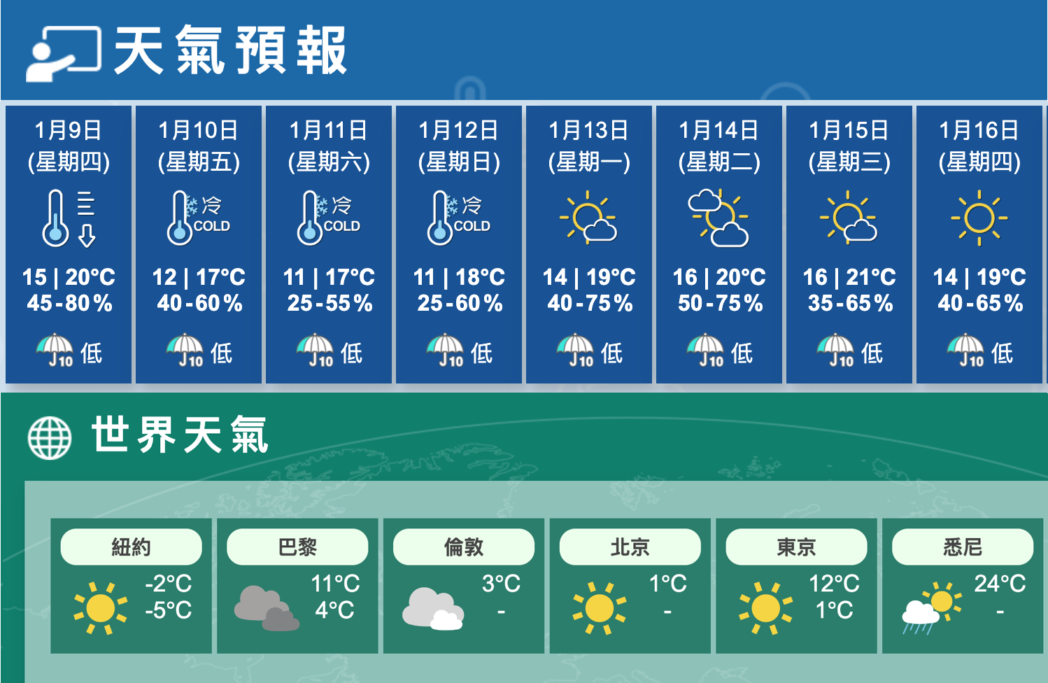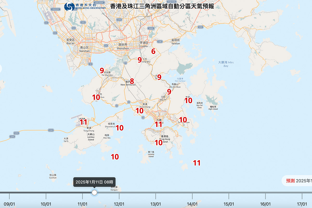 天文台表示,一股強烈冬季季候風會在明日(8日)稍後抵達華南沿岸,明日早上清涼,晚上氣溫顯著下降。周五及周末期間早上寒冷,市區氣溫在11、12度左右,新界部份地區嚴寒,大致天晴及乾燥,日夜溫差頗大。根據自動分區天氣預報,新界部份地區在周六清晨可低至6度。