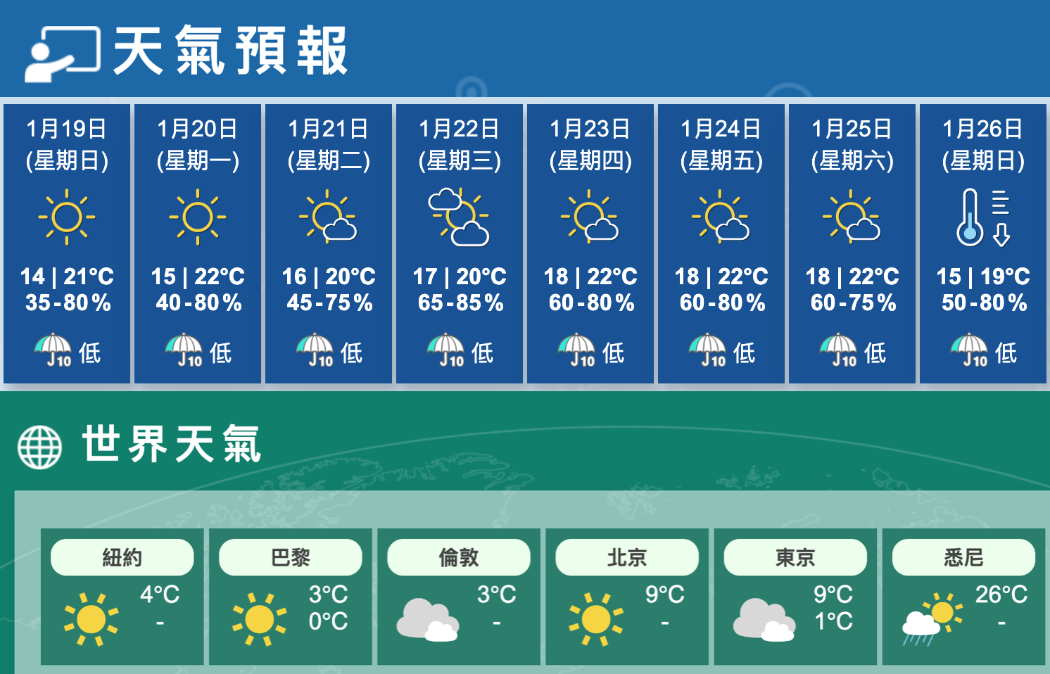 預測本港天晴。下午非常乾燥。吹微風。展望未來一兩日天晴乾燥,早上仍然清涼。星期二(21日)風勢增強。星期三雲量較多。本周後期日間和暖。