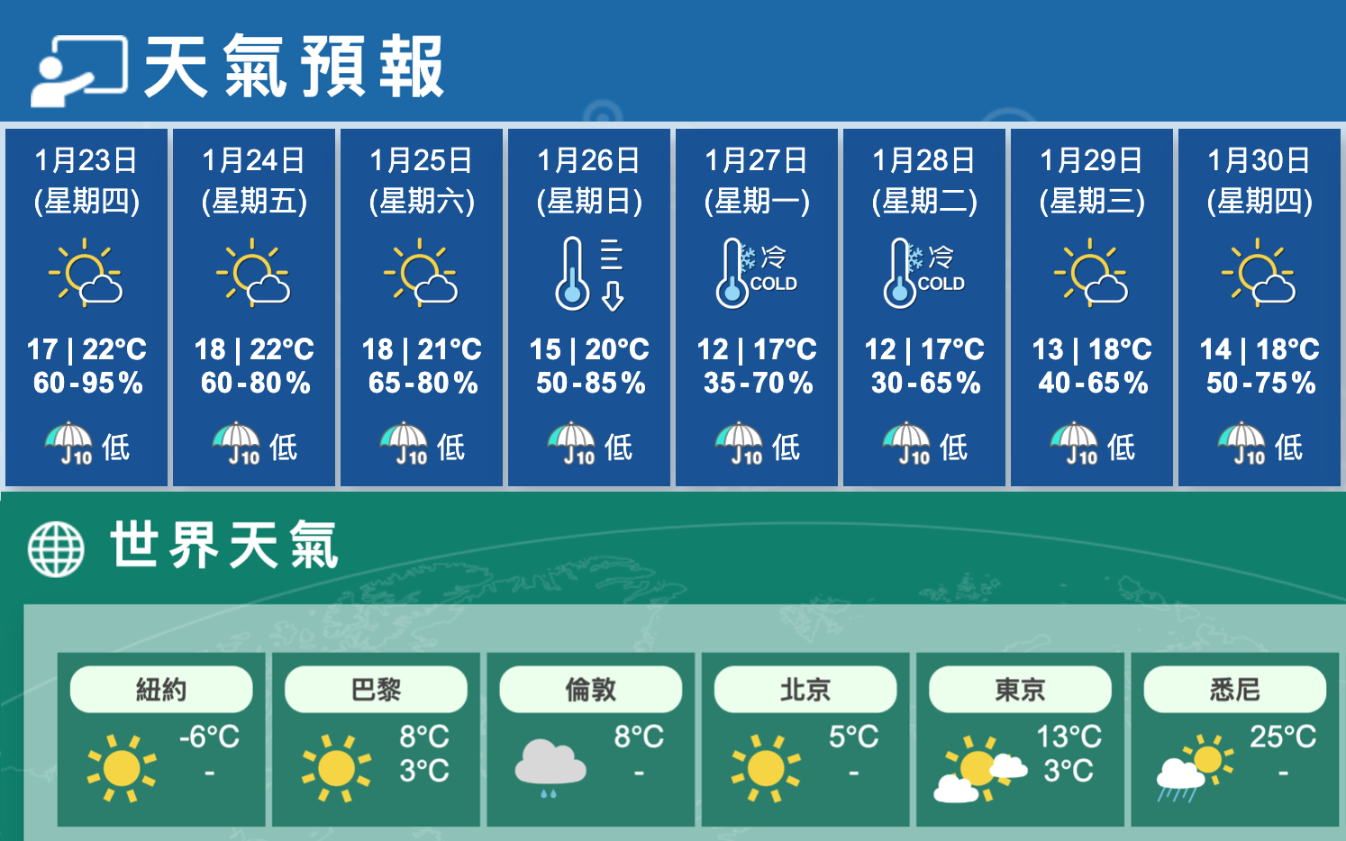 天文台展望,受一股偏東氣流影響,未來一兩日日間較為和暖。預料該偏東氣流會在周末稍為增強,而一道冷鋒會在星期日橫過華南,隨後強烈冬季季候風會在下周初帶來寒冷及非常乾燥的天氣及內陸早上的嚴寒。季候風持續影響,下周中期早晚氣溫仍然較低。@