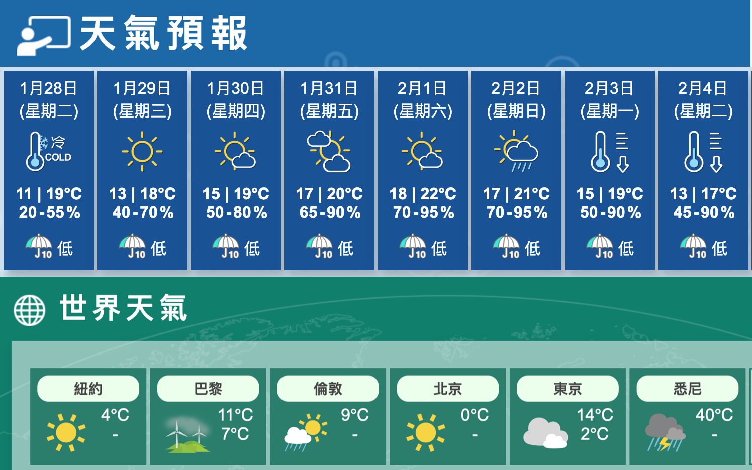 展望一周天氣概況,冬季季候風在今明兩日會繼續帶來晴朗的天氣,天氣寒冷及非常乾燥,內陸早上嚴寒。隨著季候風在本周中期被偏東氣流取代,雲量逐漸增多,風勢頗大,但早晚仍然清涼。該偏東氣流會在周末期間緩和,天氣較為潮濕,日間和暖。預料受一股東北季候風影響,下周初氣溫再度下降。@