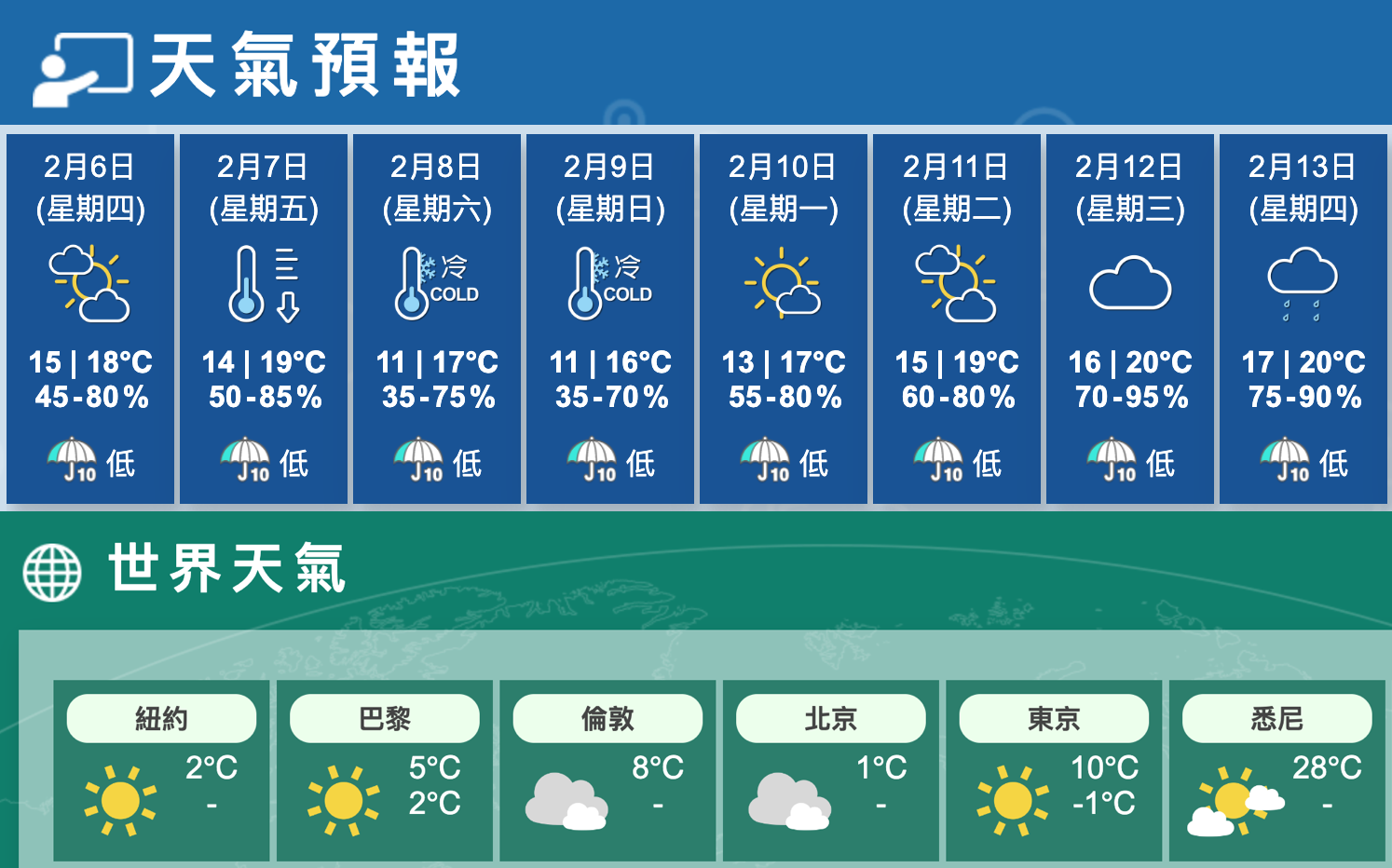 展望明日北風增強,氣溫逐步下降。周末期間早上寒冷,星期日市區最低氣溫在10度左右,新界及高地嚴寒,漸轉天晴乾燥。星期一早上仍然寒冷。下周中期氣溫稍為回升,雲量增多及較為潮濕。