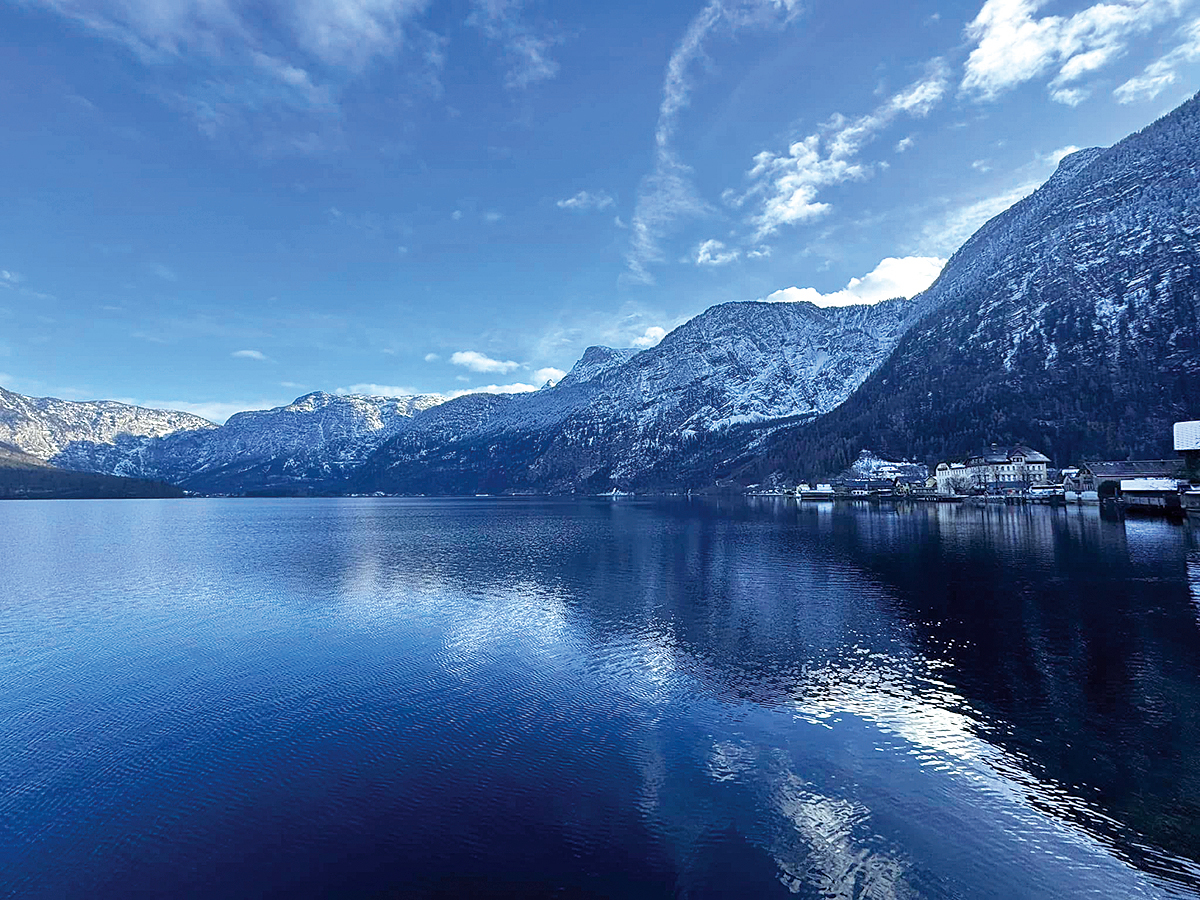 Nina在文章中描述了她抵達哈爾施塔特時,湖面的完美倒影:「一下車就有完美倒影,太幸運了。」冬日的哈爾施塔特,陽光稀少,但偶爾露出的蔚藍天空與白雪皚皚的群山,宛如一幅動人的山水畫。