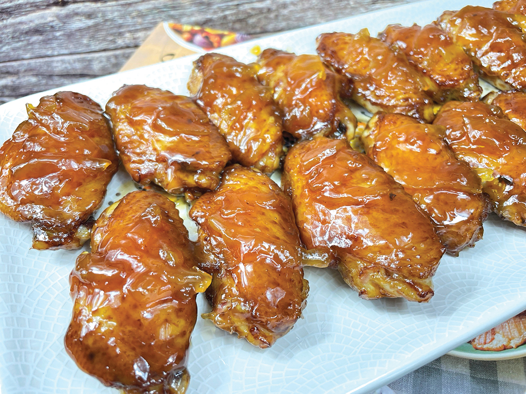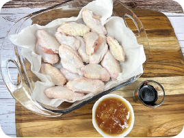 3. 預熱烤箱至350℉(177°C);雞翼擺入烤架,刷上醃料,開啓熱風循環功能烤18分鐘至熟透。大一些的雞翼需要烤久一點。
