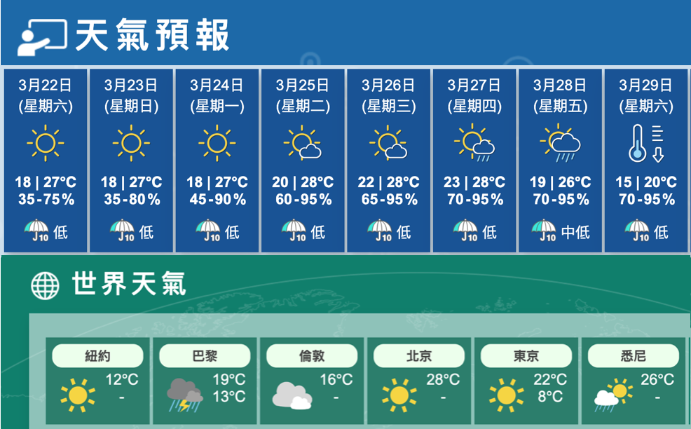 受高空反氣旋影響,未來一兩日天色普遍晴朗,風勢微弱,日夜溫差頗大。而一股偏南氣流會在下周中期影響本港,部份地區能見度較低及潮濕,日間炎熱。預料一股東北季候風會在下周後期抵達,帶來幾陣驟雨,內陸地區可能有雷暴,周末期間天氣轉涼。@