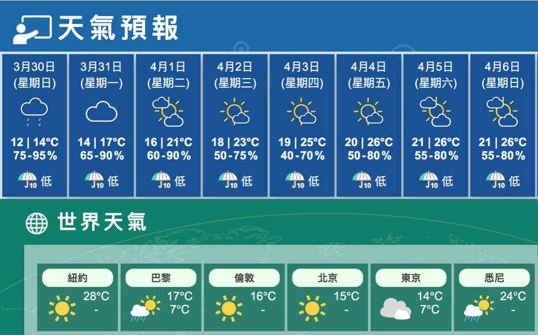 東北季候風會在未來一兩日繼續影響廣東,內陸地區天氣仍然寒冷。隨著季候風逐漸緩和,本周中後期廣東沿岸氣溫回升。同時,一股乾燥的偏東氣流會影響中國東南沿岸,該區天色普遍晴朗,日間乾燥及溫暖。@