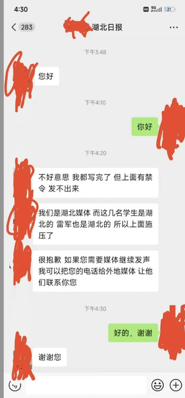 至於原因,記者於對話中表示,「我們是湖北媒體,而這幾名學生是湖北的,雷軍也是湖北的,所以上面施壓了。」#