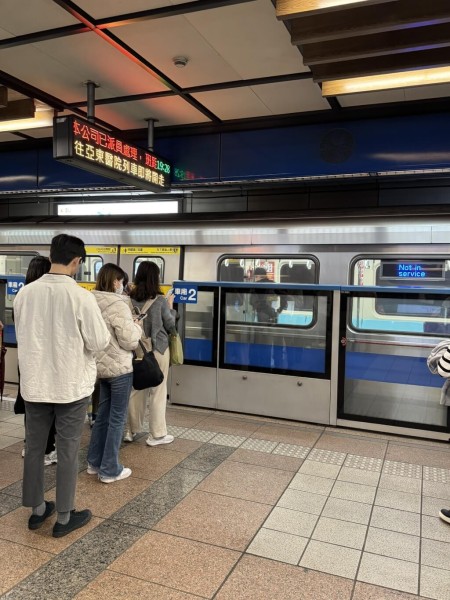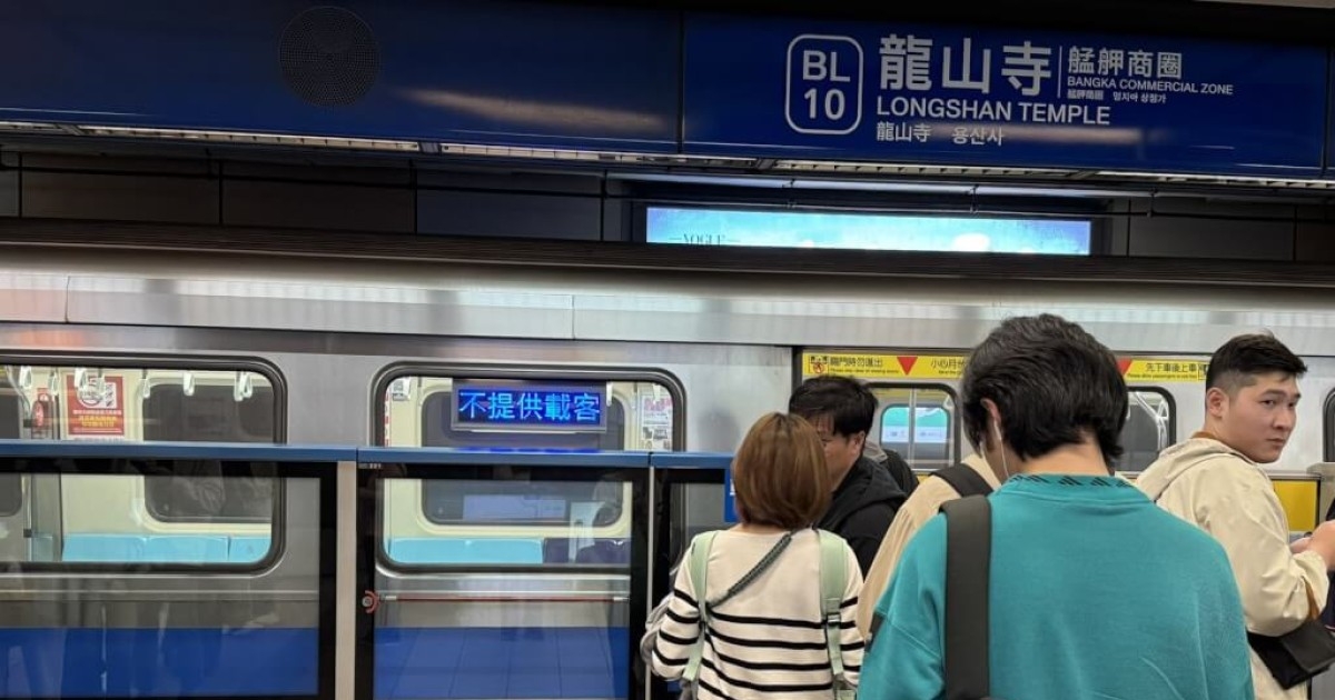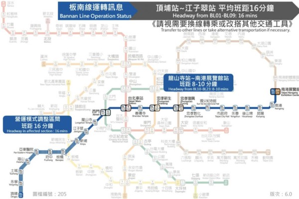 台北捷運板今天晚間近7時公告,目前板南線採取亞東醫院站至江子翠站單線雙向營運,班距約16分鐘,另啟動海山站至龍山寺站公車接駁。