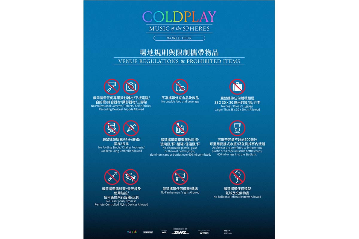 主辦單位livenationhk在社交媒體公布場地守則,指「不可携帶任何即棄膠樽裝飲品的空樽 、玻璃瓶/杯、鋁罐、保溫瓶/杯、不銹鋼瓶/杯、 容量超過600毫升的可重用便携式塑膠或矽膠水瓶/杯進入場館」,但可以「可携帶容量不超過600毫升的塑膠或矽膠可重用便携式水瓶/杯進場。」