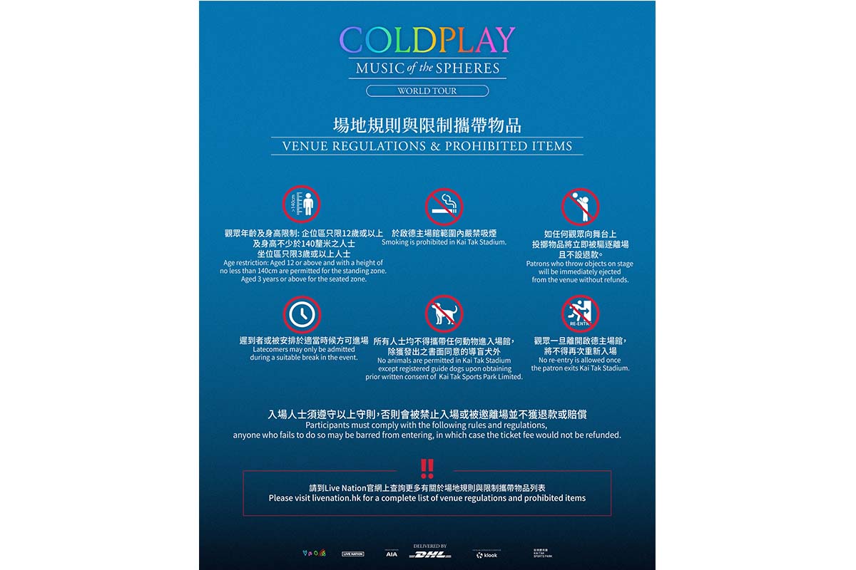 另外,觀眾進入場館前,「須接受手提袋/背包檢查,38 X 30 X 20 厘米 (15 X 12 X 8吋) 以上手提袋/背包禁止帶進表演場內」。