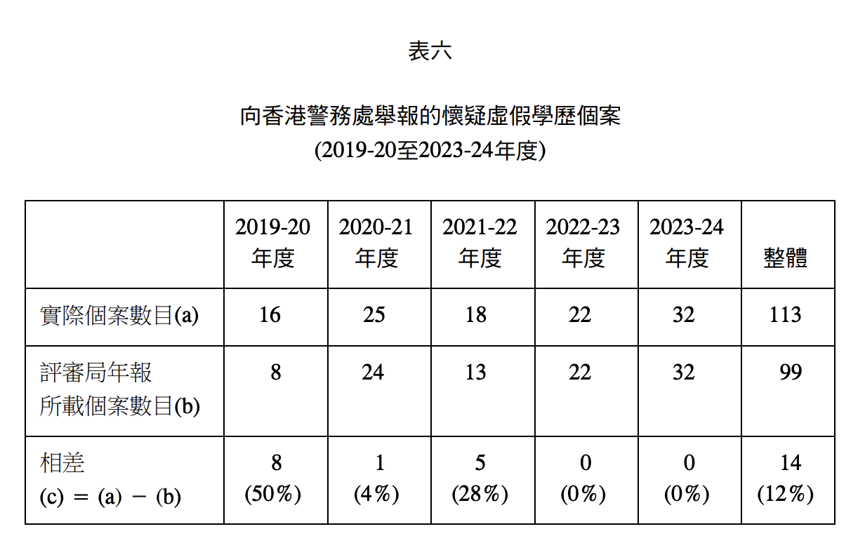 關於虛假學歷案件,評審局於2019至2024年期間向警方舉報了113宗虛假學歷案件,但在其中3個年度合計漏報14宗;在2023/24年度,案件從發現證據到舉報平均需73天,最長達172天,審計署認為舉報流程緩慢。