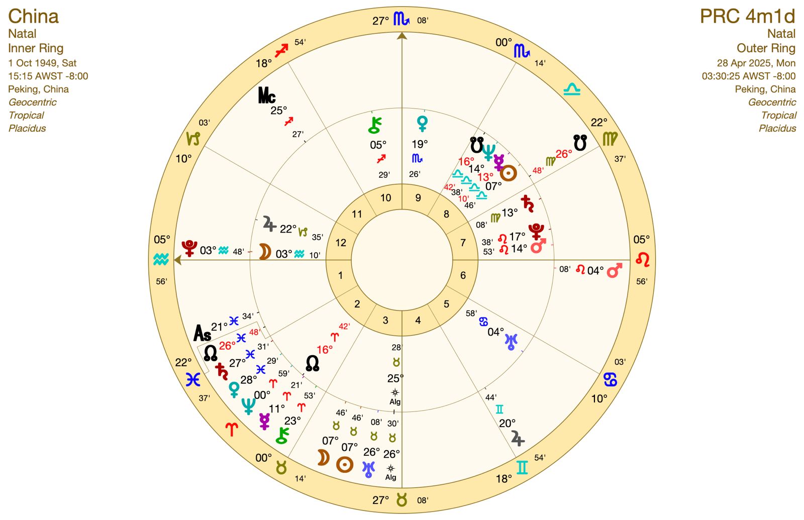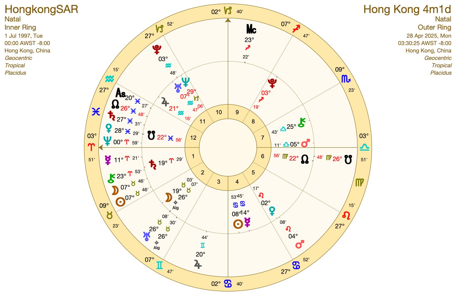 透過對中國與香港的建政本命盤和2025年4月28日的初一盤進行合盤分析,我們可以清晰看到兩地在未來一個月內將持續面臨多重重大挑戰。這些挑戰主要集中於經濟穩定性、內部社會穩定及潛藏的政治壓力。