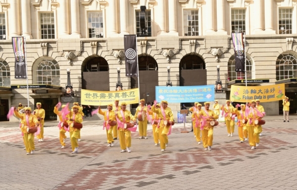 活動現場,法輪功學員先以莊重祥和的集體大煉功開場,接下來氣勢磅礴的天國樂團演奏,舒緩優美的功法展示、振奮人心的腰鼓隊、翻騰跳躍的舞龍隊、仙樂飄飄的年輕小弟子舞蹈等精彩節目讓過往行人不由自主地停下腳步,駐足欣賞,他們紛紛掏出手機記錄下美好瞬間,並高興地為學員們的精彩演出鼓掌喝彩。