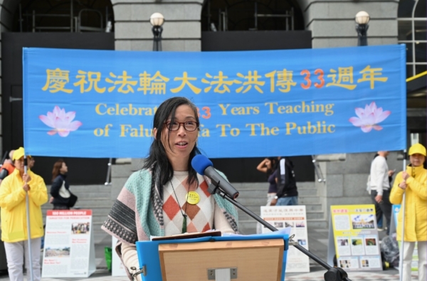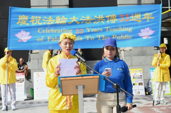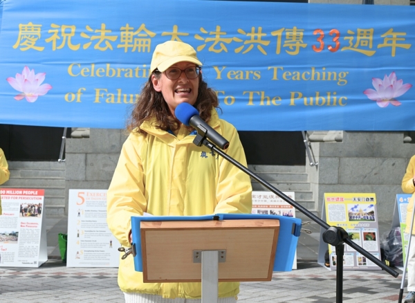 她最後說:「今天,我們共同慶祝法輪大法為世界帶來光明、信仰的自由、修煉的道路,以及在和平堅靭中展現出的力量。」