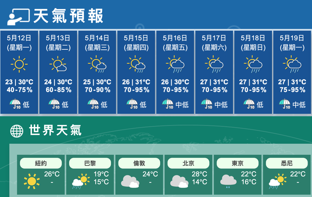 展望未來數天部份時間有陽光及炎熱,本周中至後期天氣炎熱,亦有一兩陣驟雨。而高空擾動則會在下周初帶來不穩定天氣。@