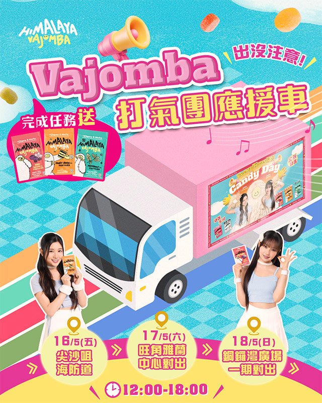 來自馬來西亞的糖果品牌Himalaya,繼早前推出岩鹽運動糖後,再將Himalaya Vajomba軟糖全新系列帶來香港。Himalaya Vajomba的Yeti聯同人氣女團COLLAR兩位成員Candy(王家晴)和Day(許軼)組成Vajomba打氣團,應援車將於5月16日至18日,一連3日現身於旺角、尖沙咀及銅鑼灣同大家派糖。