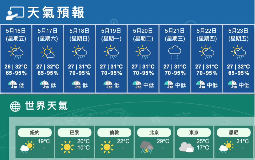 本港地區預測本今日短暫時間有陽光,亦有一兩陣驟雨。日間炎熱,市區最高氣溫約32度,新界再高一兩度。吹輕微至和緩東南風。最高紫外線指數約為10,強度屬於甚高。