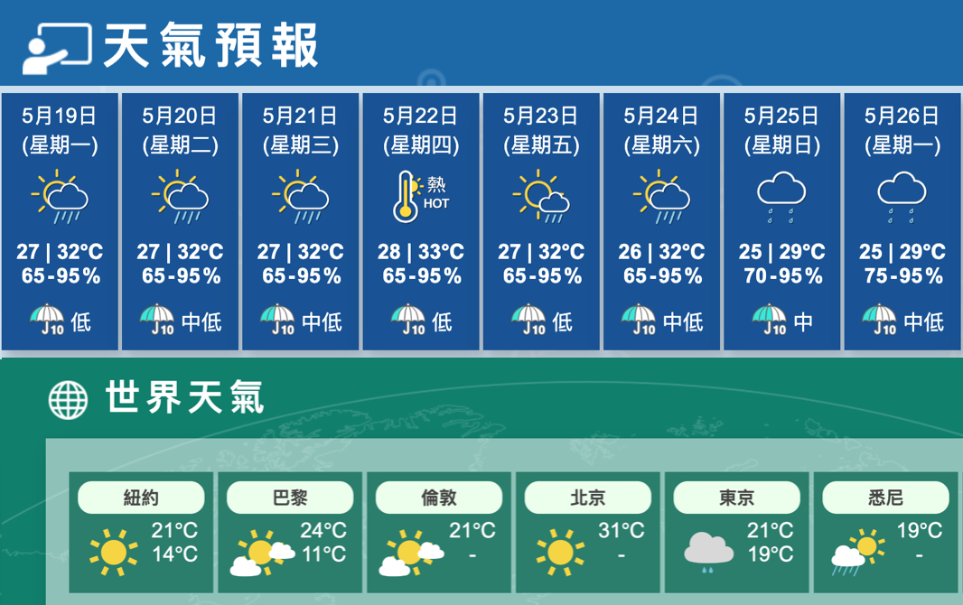 展望未來數日明日有幾陣驟雨,隨後兩三日天氣酷熱,部分時間有陽光。@