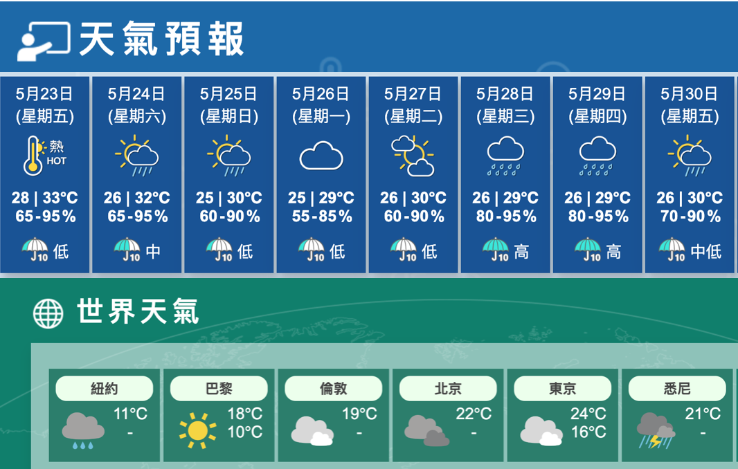 展望明日有幾陣驟雨,隨後一兩日氣溫稍為下降及較乾燥。下周中期有驟雨及雷暴。@