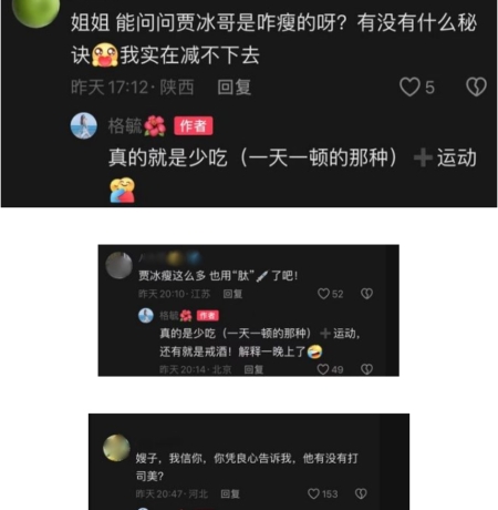 有網民留言詢問賈冰的瘦身方法,甚至質疑賈冰使用處方藥司美格魯肽(Semaglutide)打針減肥。賈冰的妻子回覆時否認,並表示:「真的就是少吃(一天一頓的那種)+運動。」