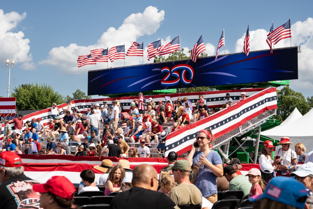 在演說開始前的博覽會上,數以千計的與會者身穿特朗普相關商品,紅、白、藍三色服飾成為當天的主色調。