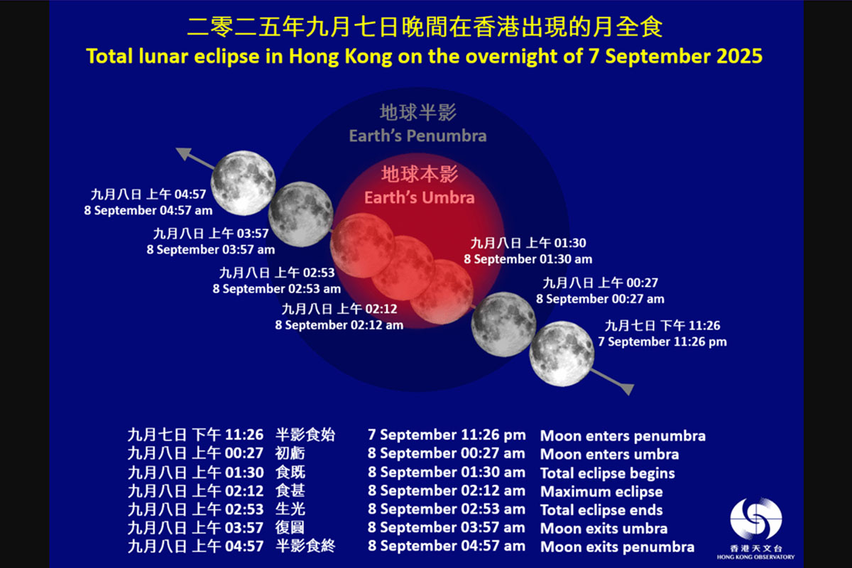 天文台表示,本港上空9月7日深夜至8日凌晨將出現月全食。若天氣情況許可,市民可以肉眼直接觀賞整個月全食過程。
