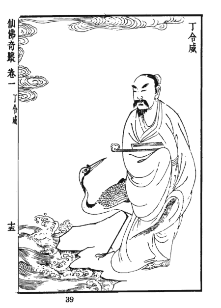 據晉陶潛《搜神後記》,丁令威,本為遼東人,學道於靈虛山。後來化為仙鶴回來,停在城門前的石柱上。當時有個少年,舉起弓箭要射他。仙鶴就飛起來,在空中徘徊,說:「有鳥有鳥丁令威,去家千年今始歸。城郭如故人民非,何不學仙冢壘壘。」然後高飛沖天而去。丁令威和其修仙得道的故事,在道教信仰中非常受重視,對中國的文史典故和成語故事影響也很大。