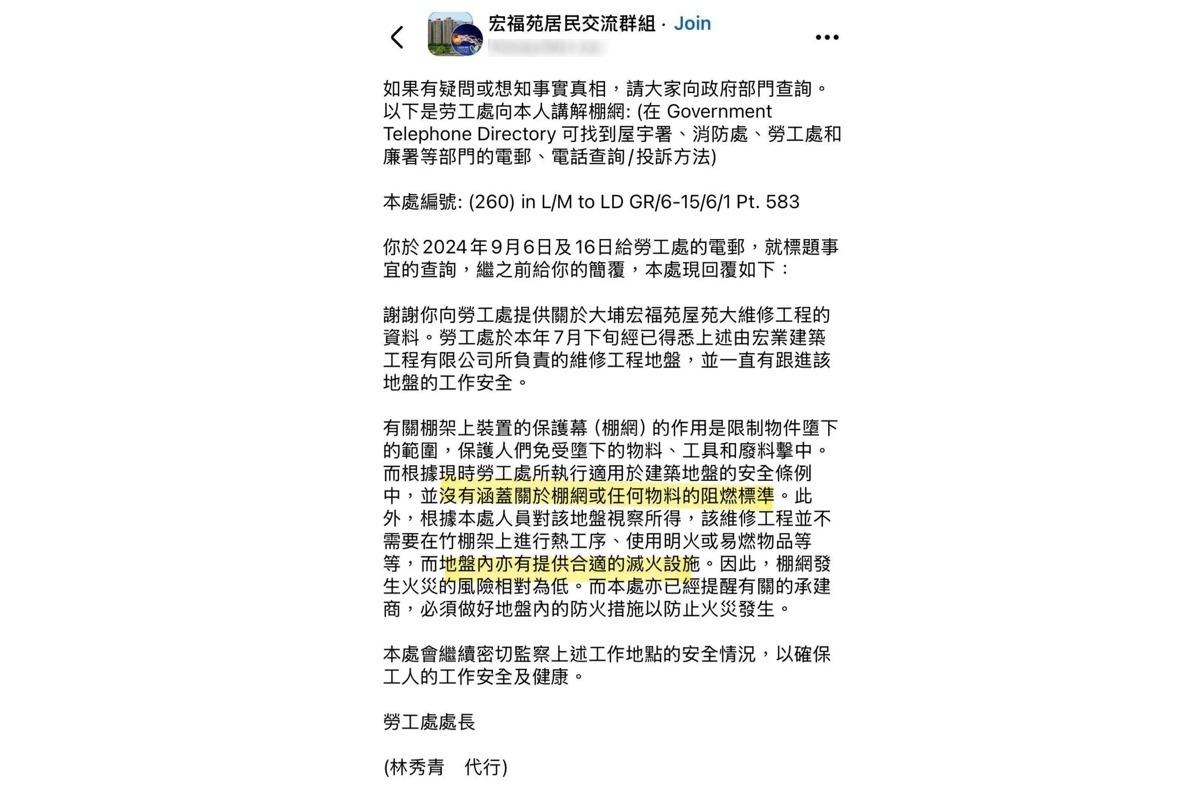 關於有關棚網阻燃性的爭議,勞工處表示,去年曾回覆市民查詢,但承認去年10月4日的電郵在有關棚網阻燃性的表述欠清晰,可能引致誤會。處方解釋,當時回覆所指「棚網發生火災的風險相對為低」,是基於該工程並不涉及在建築物外部施行如燒焊等熱工序。該說法並不等同忽視火災風險,處方當時亦已提醒承建商落實地盤防火措施。