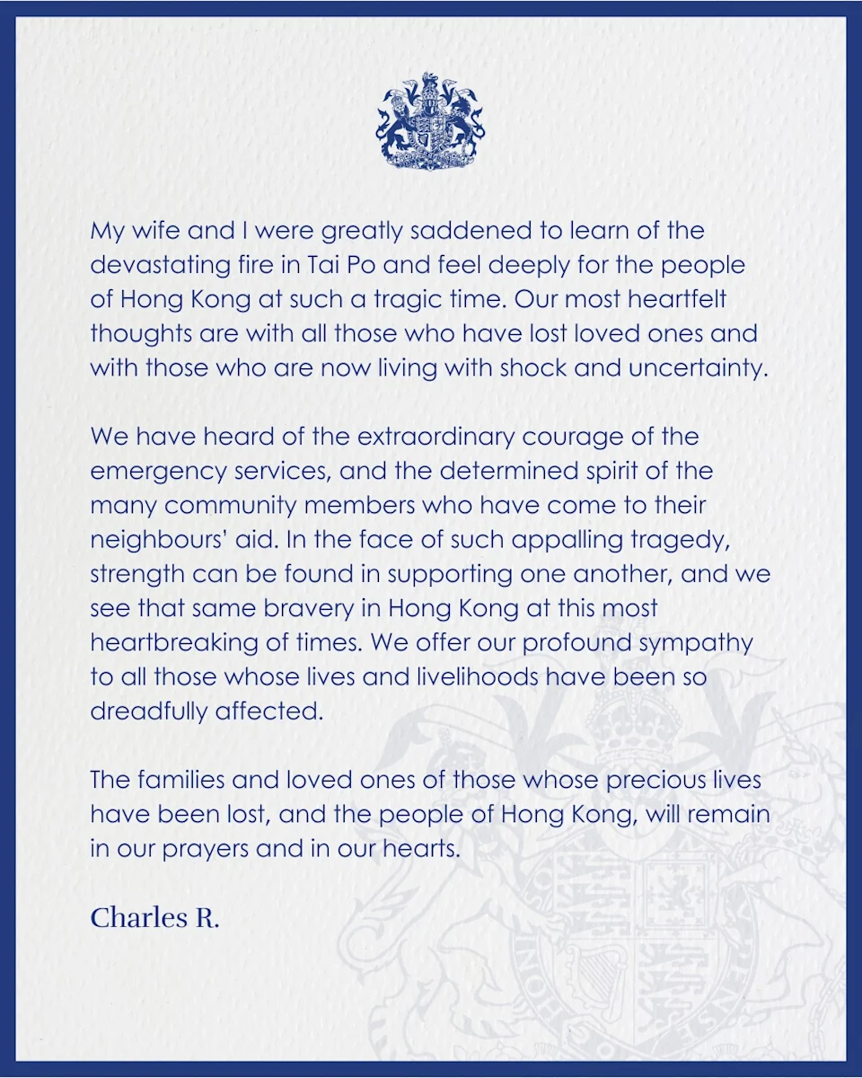 英王表示,聽到救援人員的非凡勇氣,以及社區人士在互助中找到力量,在這個最令人心碎的時刻展現出香港的勇敢,兩人向所有生活受影響的人表示深切同情。他會為那些失去至親的家人和親人,以及香港市民祈禱。