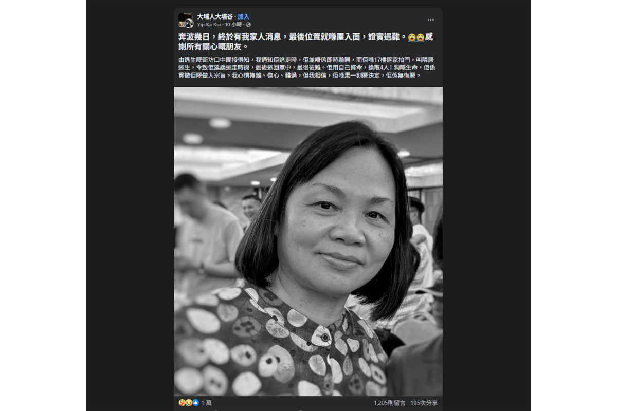 宏福苑災火中有將近百人身亡,多具遺體仍有待辨認,不少家屬連日尋找失聯家人的消息。其中有家屬在今日(1日)於Facebook帖文表示,在連日奔波後,確定自己的太太在家中遇難,她案發時一度自己逐戶通知鄰居,但自己卻不幸罹難,許多網民留言哀悼。