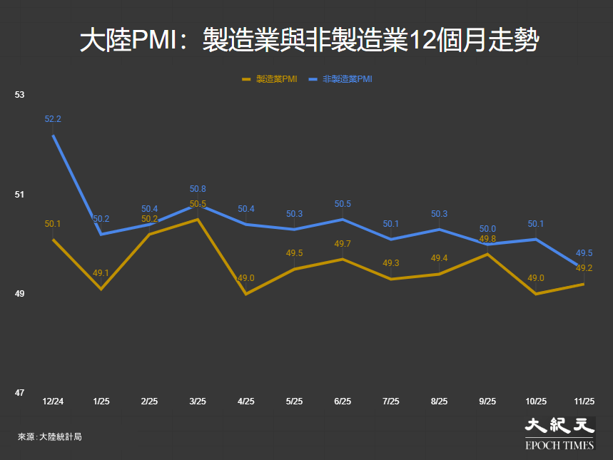 大陸統計局於30日公布最新採購經理指數(PMI)運行情況,製造業PMI的11月份所錄得之數值為49.2,符合市場預測,相比上月49.0有所增強,但此乃連續第八個月低於50的強弱臨界線。中國製造商面臨持續疲弱的需求、國內日益激烈的價格競爭,以及在全球不確定性下對出口前景保持審慎態度。