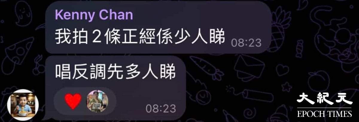 Kenny上周六(27日)在社交平台發表影片,神情嚴肅地稱大火死傷者是「罪孽深厚」、「罪有應得」,更稱不需要同情死傷者,言語間露出笑容。陳日前還在火災現場自拍,面帶笑容兼舉起勝利手勢。有讀者提供的截圖顯示,一名自稱Kenny的網民,曾在一個Telegram群組中稱「我拍兩條正經(片段)係少人睇,唱反調先多人睇」,並獲一名網民讚好言論。