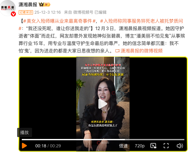 據《瀟湘晨報》「晨影片」12月3日報道,中國入殮師博主「潘美麗不怕見鬼」從事殯葬行業15年,她的信念簡單都沉重,「我不怕『鬼』,因為送走的都是大家日思夜想的親人。」