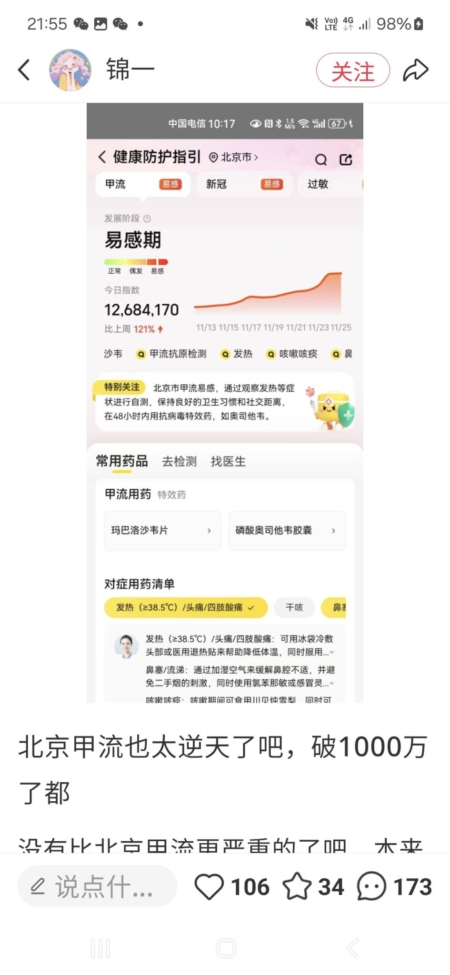 而根據大陸的「健康防護指引」的流感「易感期」的今日指數顯示,北京已經超過1千2百萬人感染(12,684,170),比上周增加了121%,因此有網民感嘆北京這一波甲流太逆天了,沒有比北京甲流更嚴重的了。